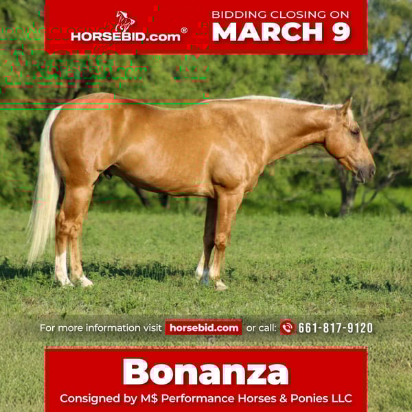 ℳ𝒶𝓇𝒸𝒽 ♦️𝐑𝐈𝐃𝐄𝐑'𝐒 𝐂𝐇𝐎𝐈𝐂𝐄♦️ Happening now thru MONDAY | MARCH 9th - Available EXCLUSIVELY on HorseBid's website! For more details and to register visit: www.Horsebid.com CONSIGNOR CONTACT: M$ Performance Horses & Ponies LLC 661-817-9120 LOCATION: Whitesboro,Texas BREED: Quarter Horse REGISTERED: No REGISTERED NAME: Bonanza COLOR: Palomino HEIGHT: 14.3 AGE: 8 GENDER: Gelding Have you been on the lookout for that perfect equine partner to share countless adventures with? Well, let me introduce you to the absolute star of the show—Bonanza! This stunning 8-year-old gelding stands at a lovely 14.3 hands and is quite possibly the prettiest blonde around! With a background that’s as diverse as they come, Bonanza has dabbled in everything from ranch work to miles of scenic trails, and he’s even spent long hours at the cow sale every week. Talk about a versatile guy! Bonanza is exceptionally well-trained. He’ll glide through perfect circles at the walk, trot, and lope in the arena, and he’s definitely got a bit of that “cowy” spirit—watch out cows, he’s the boss around here! But don’t let that cowboy demeanor fool you; he’s just as happy to take a leisurely stroll down the trail, making memories with his rider. Trustworthiness is his middle name; he always gives his best when asked. We’ve worked cattle with him without a bridle and even ridden him bareback—all while he shows off his impressive skills. If you’re searching for a lovey-dovey type horse who adores being spoiled, Bonanza is your guy! He’s the kind of ranch horse that thrives on affection. No matter where you point him, he’ll go—right down the highway, past those big semi trucks, or even to the famous historical Fort Stockyards on a bustling Saturday. His calm, confident attitude makes him a true seasoned veteran in any situation! Bonanza is also a pro at side passing to open and close gates, crossing water and bridges, and even carrying flags. There’s truly nothing this guy can’t handle! He’s a unicorn in the horse world, and I could go on and on about how perfect he is. Trust me, Bonanza is just that special! If you’re ready to add this incredible companion to your family, don’t hesitate to reach out! He is UTD on everything teeth, new shoes, vaccines and worming. You won’t have to worry about getting anything done just take him out and enjoy him. We are open to anyone interested in him to schedule a time to come see him or if you can’t make it schedule a FaceTime showing to see him. If you need help with transport don’t hesitate to ask we have a list of reputable haulers that can get him safely to your doorstep WORLD WIDE including, Alaska , Mexico, Hawaii, Canada and anywhere in between from Stephenville, TX.