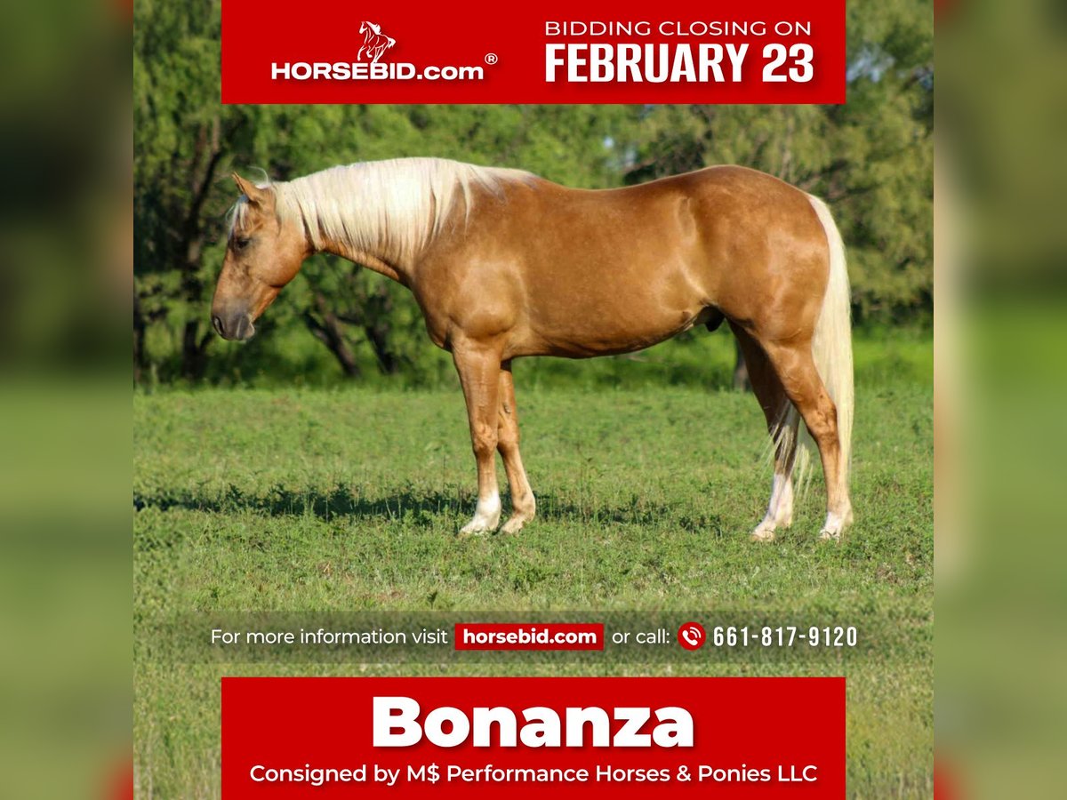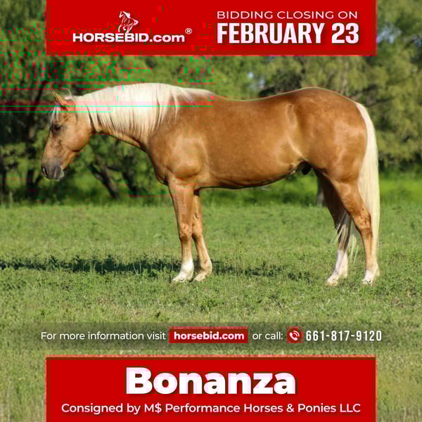 💎 𝐓𝐇𝐄 𝓓𝓲𝓪𝓶𝓸𝓷𝓭 𝐒𝐇𝐎𝐖𝐂𝐀𝐒𝐄 💎 Happening now thru MONDAY | FEBRUARY 23rd - Available EXCLUSIVELY on HorseBid's website! For more details and to register visit: www.Horsebid.com CONSIGNOR CONTACT: M$ Performance Horses & Ponies LLC 661-817-9120 LOCATION: Stephenville,Texas BREED: Quarter Horse REGISTERED: No REGISTERED NAME: Bonanza COLOR: Palomino HEIGHT: 14.3 AGE: 8 GENDER: Gelding Have you been on the lookout for that perfect equine partner to share countless adventures with? Well, let me introduce you to the absolute star of the show—Bonanza! This stunning 8-year-old gelding stands at a lovely 14.3 hands and is quite possibly the prettiest blonde around! With a background that’s as diverse as they come, Bonanza has dabbled in everything from ranch work to miles of scenic trails, and he’s even spent long hours at the cow sale every week. Talk about a versatile guy! Bonanza is exceptionally well-trained. He’ll glide through perfect circles at the walk, trot, and lope in the arena, and he’s definitely got a bit of that “cowy” spirit—watch out cows, he’s the boss around here! But don’t let that cowboy demeanor fool you; he’s just as happy to take a leisurely stroll down the trail, making memories with his rider. Trustworthiness is his middle name; he always gives his best when asked. We’ve worked cattle with him without a bridle and even ridden him bareback—all while he shows off his impressive skills. If you’re searching for a lovey-dovey type horse who adores being spoiled, Bonanza is your guy! He’s the kind of ranch horse that thrives on affection. No matter where you point him, he’ll go—right down the highway, past those big semi trucks, or even to the famous historical Fort Stockyards on a bustling Saturday. His calm, confident attitude makes him a true seasoned veteran in any situation! Bonanza is also a pro at side passing to open and close gates, crossing water and bridges, and even carrying flags. There’s truly nothing this guy can’t handle! He’s a unicorn in the horse world, and I could go on and on about how perfect he is. Trust me, Bonanza is just that special! If you’re ready to add this incredible companion to your family, don’t hesitate to reach out! He is UTD on everything teeth, new shoes, vaccines and worming. You won’t have to worry about getting anything done just take him out and enjoy him. We are open to anyone interested in him to schedule a time to come see him or if you can’t make it schedule a FaceTime showing to see him. If you need help with transport don’t hesitate to ask we have a list of reputable haulers that can get him safely to your doorstep WORLD WIDE including, Alaska , Mexico, Hawaii, Canada and anywhere in between from Stephenville, TX.
