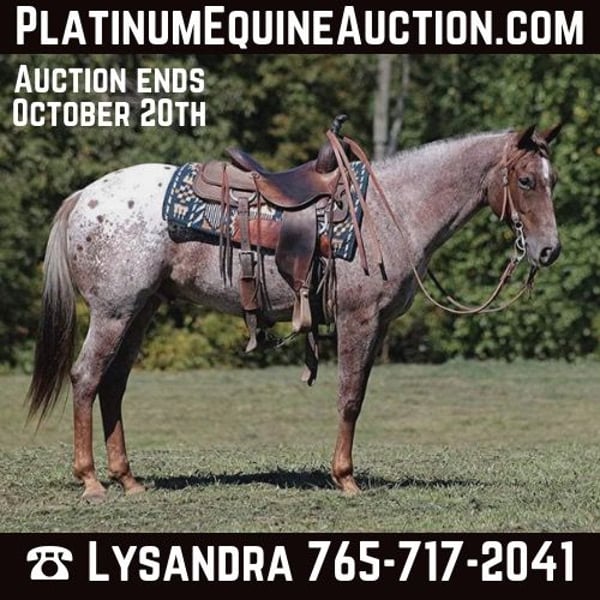 ONLINE AUCTION Place your bids at www.PlatinumEquineAuction.com Starting Bid $3500 Auction ends October 20th, 2024 Need a new saddle? Check out White Rock Saddles on our website or Facebook! Apache is a beautifully marked, 14.3H, 6 year old, Bay Appaloosa Horse Gelding. Apache is a well traveled horse that has been ridden in several states. He has been trail ridden in several states. He will cross creeks, ditches, logs and navigate rough rocky areas. Apache is safe riding in traffic. He has a smooth jog and a nice lope! Apache has been exposed to all kinds of wildlife such as deer or turkey or other animals like cows or dogs and will go anywhere that he is asked too. He has been rode many miles in the mountains of Eastern Kentucky and encountered every obstacle possible on the trail. He will go up or down even the steepest slopes, across deep creeks, over downed trees, and over all types of rough terrain while still being sure footed. If you have any questions call Lucky 13 Equine Lysandra 765-717-2041. Located in Brodhead, KY. ONLINE AUCTION Place your bids at www.PlatinumEquineAuction.com Starting Bid $3500 Auction ends October 20th, 2024 Need a new saddle? Check out White Rock Saddles on our website or Facebook!