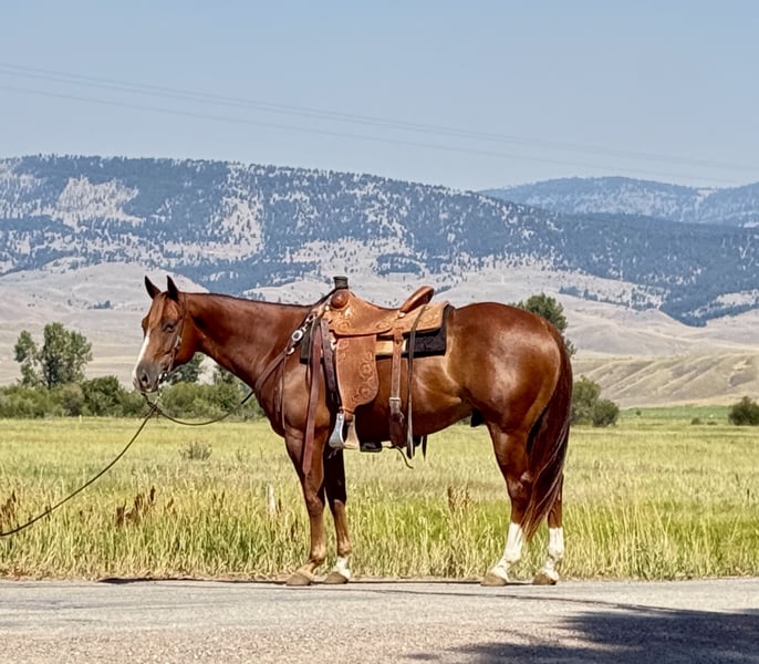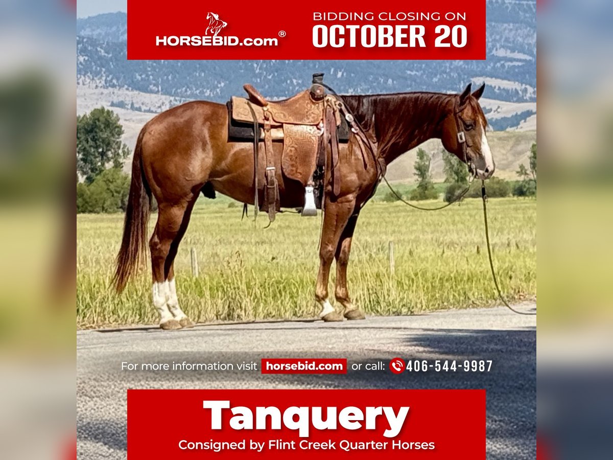 ♦️ 𝐭𝐡𝐞 𝐀𝐌𝐄𝐑𝐈𝐂𝐀𝐍 𝓕𝓪𝓵𝓵 𝓒𝓵𝓪𝓼𝓼𝓲𝓬 ♦️ Happening now thru MONDAY | OCTOBER 20th - Available EXCLUSIVELY on HorseBid's website! For more details and to register visit: www.Horsebid.com CONSIGNOR CONTACT: Flint Creek Quarter Horses 406-544-99987 LOCATION: Drummond MT BREED: Quarter Horse REGISTERED: No REGISTERED NAME: Tanquery COLOR: Sorrel HEIGHT: 15 AGE: 7 GENDER: Gelding Tanquery is a sorrel seven-year-old grade gelding that stands 15 hands tall. He is out of a Tanquery Gin bred stud, and a good cow horse mare that was not registered so he sells grade. This guy is a really nice ranch and trail horse that is very gentle and has a great handle on him. He is a fast walking, confident guy that is fun to go do any job on. He has drug calves to the branding fire and has roped and doctored lots of cattle in the pasture. He is really good too sort cattle on and will get down and dirty with a cow. He has a good one hand neck rein and operates really well. He will lope nice circles in the arena and has a big stop. Turns around both directions and will easily step to his correct leads. He would make a great team penning or sorting horse and would finish into a team roping horse easily. This guy is fun to take to the mountains to trail ride or gather cows on as he is a fast walker and will keep those bridle reins swinging. This is the kind of horse that I really enjoy riding. He is really good minded and tries hard to be a good willing partner with you. He crosses water and the other obstacles easily and has no bad habits. Good too shoe and haul and loves to get a bath when he’s done working for the day. He has never offered to buck or be silly with us and is the kind you can lay off until you need him and he will saddle up the same. He is trained to let you climb up on a stump or step and simply smooch to him and he will side pass over and make it easy to get on. He is a really nice using Horse that has class and eye appeal with a long mane that hangs to the bottom of his neck. this is a solid individual that is the perfect age. If you are in need of one like this, feel free to give us a call and come and try him at the ranch to see if it’s a good fit for you. Please call and we will tell you everything we know about this good gelding. call or text Tom at 406-544-9987.