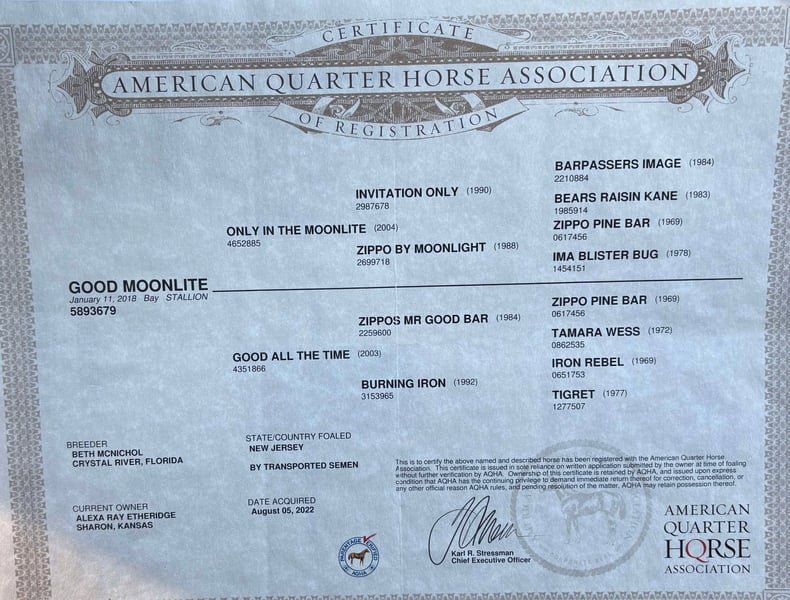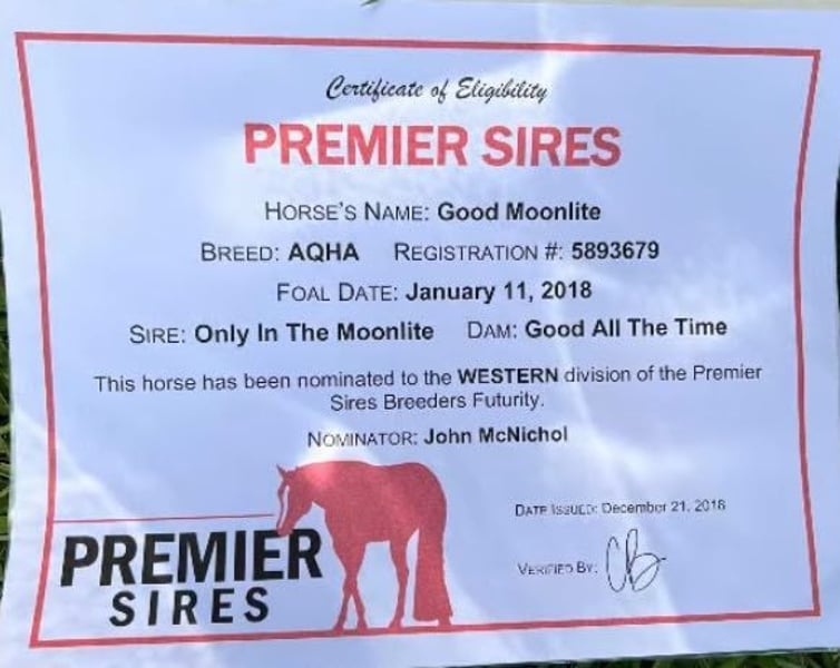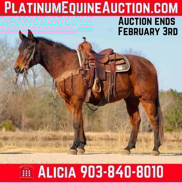 NLINE AUCTION Place your bids at www.PlatinumEquineAuction.com Starting Bid $3500 Auction ends February 3rd, 2025 Need a new saddle? Check out White Rock Saddles on our website or Facebook! aka “Moonpie” 2018 Bay AQHA/NSBA Moonpie is a registered Quarter Horse gelding. He is 7 years old. Moonpie has excellent AQHA bloodlines and is an own son of Only In The Moonlite. He is bred to be a show horse and has the talent to do so! He has a nice level headed jog and lope for western pleasure and the looks for hunter under saddle. He has done some local shows and playdays for fun. Moonpie will lope out of his tracks and has a one hand neck rein. Moonpie has also been ridden on the trails. He will jump down logs, go over bridges etc anything you want him to do. He has a willing mindset and a friendly personality. He will meet you at the gate every time. Moonpie does not have any bad habits or vices. He loads, leads, bathes etc well. He gets along well in a mixed herd. Please call Alicia Darling 903-840-8010 if you’d like more information on Moonpie Located in Canton, TX. ONLINE AUCTION Place your bids at www.PlatinumEquineAuction.com Starting Bid $3500 Auction ends February 3rd, 2025 Need a new saddle? Check out White Rock Saddles on our website or Facebook!