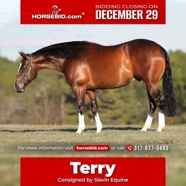 ⚜️ 𝓗𝓮𝓻𝓲𝓽𝓪𝓰𝓮 𝐖𝐢𝐧𝐭𝐞𝐫 𝓒𝓵𝓪𝓼𝓼𝓲𝓬⚜️ Happening now thru MONDAY | DECEMBER 29th - Available EXCLUSIVELY on HorseBid's website! For more details and to register visit: www.Horsebid.com CONSIGNOR CONTACT: Slavin Equine 317-677-5403 LOCATION: Whitesboro, TX BREED: Quarter Horse REGISTERED: Yes REGISTERED NAME: GT Oh COLOR: Bay HEIGHT: 15 AGE: 7 GENDER: Gelding If you’re searching for a gelding that can quietly pack a beginner down the trail one day and confidently step into the performance arena the next, meet Terry! A gorgeous 15-hand, 7-year-old bay gelding with a heart as big as his stop, Terry has been with one owner his entire life, giving him a solid foundation built on consistency, trust, and care. He’s exceptionally personable, greeting you at the gate with ears forward and soft eyes—always willing, curious, and full of character. Terry is a trained reining horse that has been hauled and shown. He has competed at some local ranch riding shows and placed first. He has been around cattle and rode miles outside. Whatever you set your mind to he has had the miles and training to be right there with you! Terry goes exactly at the pace you ask. He naturally slows down for a little kid or total beginner without hesitation, yet he is equally happy to step up when asked. His jog, lope, and long trot are smooth, balanced, and comfortable, making every ride a joy. He has a huge, confident stop, clean, easy turnarounds, and effortless lead departures. Whether it’s a simple ride around the ranch or a trail ride across varied terrain, Terry remains steady, responsive, and confident every step of the way. He’s been around cattle and navigates new situations or arenas with ease. On the ground, Terry is just as easygoing. Polite, kind, and fun to be around, he has a personality that keeps you smiling—expressive, affectionate, and always eager for scratches or treats. He’s a gentleman in the stall, excellent in cross-ties, loads and hauls without issue, and a solid citizen in new places. His ears-forward, kind nature makes him approachable and comforting for riders of all ages and experience levels. Terry is sound, well-built, and just all around dependable. He’s a horse you can ride every day—or give a week or two off and jump back on, confident that he’ll be exactly the same. With smooth, balanced gaits, a willing attitude, and a big personality, Terry is versatile, consistent, and ready to become your next lifelong partner. Pedigree-wise, Terry is sired by Gunners Tinseltown, an earner of $307,000 and a Million Dollar Sire. His dam, Mob Gal, is a granddaughter of the legendary Smart Chic Olena, giving Terry both the talent and mind that riders look for. Terry comes with a current vet letter and clean X-rays on file. Located in Whitesboro, Texas, we welcome anyone to come meet and try Terry to see for themselves why we love him so much. If you’re looking for a horse with the heart, talent, and personality to be both a competitive partner and a family-friendly ride, don’t let this one pass you by. We can help arrange hauling and have shipped horses all over the United States and even internationally! Don’t hesitate to call us with any questions!
