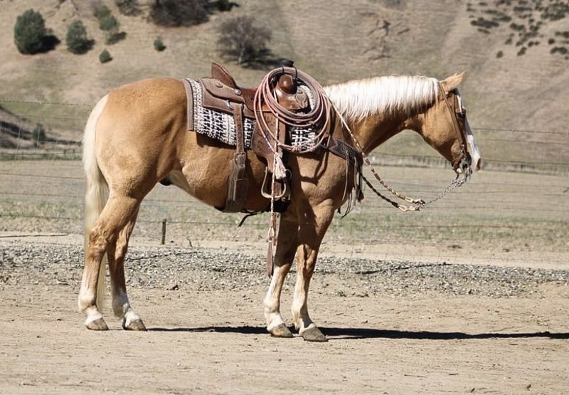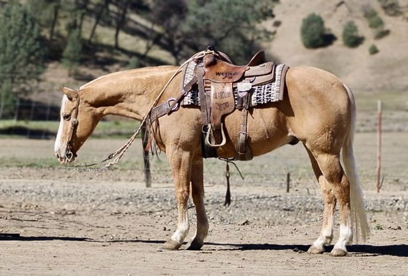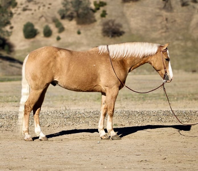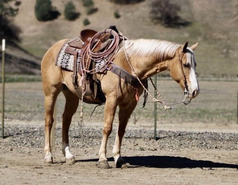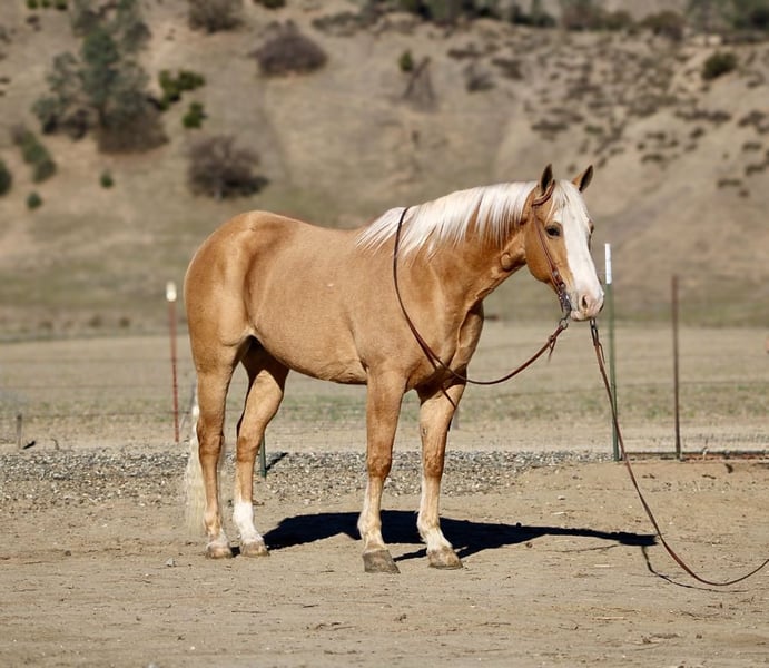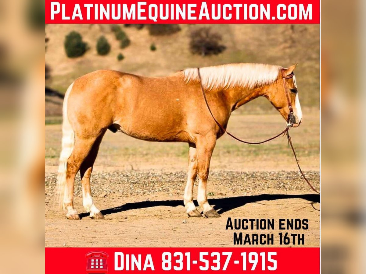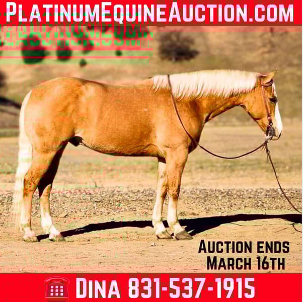 ONLINE AUCTION Place your bids at www.PlatinumEquineAuction.com Starting Bid $3500 Auction ends March 16th, 2025 Need a new saddle? Check out White Rock Saddles on our website or Facebook! Amaretto is the most stunning 7-year-old palomino gelding, standing at an impressive 15 hands. His striking golden coat, complemented by his beautiful blonde mane and tail, make him a true knockout in any setting. From his beauty to his confident demeanor, Amaretto exudes elegance and grace. Amaretto has been a joy to work with. He has proven himself on the trails, fearlessly navigating steep hills, logs, and even crossing rivers with ease. No obstacle is too daunting for this fearless gelding. In the arena, Amaretto’s progress has been equally impressive. He calmly picks up leads and transitions into a collected trot effortlessly. His stop and backup are smooth and precise, making him an absolute pleasure to ride. One of the most remarkable qualities of Amaretto is his willingness to please. He approaches new obstacles with confidence and takes them on without any fuss or hesitation. Whether it’s navigating through balls, tarps or bridges, Amaretto handles it all with grace and poise. In addition to being an exceptional riding partner, Amaretto also possesses excellent ground manners. He is easy to handle and stands quietly while being saddled or bridled. He clips without any issues and stands patiently for the farrier. This well-mannered gelding is truly a pleasure to be around. Amaretto’s potential knows no bounds in terms of discipline or adventure opportunities. With his calm demeanor and willingness to try anything asked of him, he has all the makings of a versatile horse that can take you anywhere you want to go whether it be trail riding in the mountains or competing in various disciplines at shows. Amaretto is equally content riding alone or in groups he simply thrives on human companionship regardless of the setting. His adaptability extends beyond just riding he stalls well but is equally content to be turned out in the pasture. If you are looking for a horse that will make an excellent partner and bring joy to your riding experience, Amaretto is the horse for you. Please contact Longhorn Ranch Dina at 831-537-1915, located in Paicines, CA. Experience firsthand the beauty and talent of this distinguished golden palomino gelding – it’s an opportunity not to be missed. ONLINE AUCTION Place your bids at www.PlatinumEquineAuction.com Starting Bid $3500 Auction ends March 16th, 2025 Need a new saddle? Check out White Rock Saddles on our website or Facebook!
