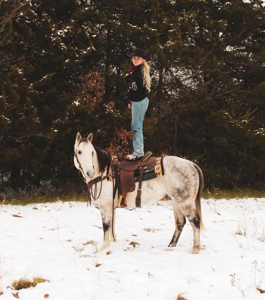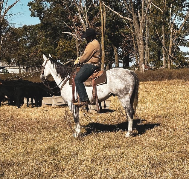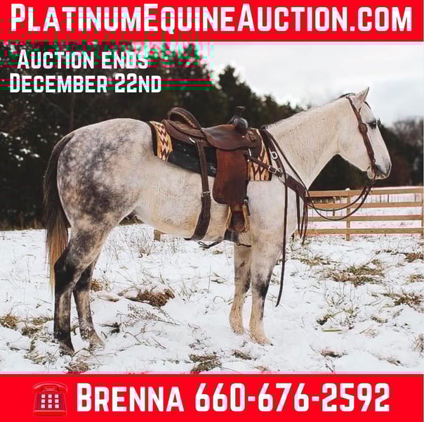 ONLINE AUCTION Place your bids at www.PlatinumEquineAuction.com Starting Bid $3500 Auction ends December 22nd, 2024 Need a new saddle? Check out White Rock Saddles on our website or Facebook! If you are on the lookout for an extremely versatile, handy, good minded, and absolutely stunning gelding to add to your life look no further! This guy is the whole package. “Goose” is a 6 year old gorgeous dapple grey gelding standing right at a perfect 15 hands tall. I do not have enough good things to say about this horse. I have throughly enjoyed every moment of being around him and he has been a barn favorite amongst everyone he meets! Goose here has all the bells and whistles you could ask for. A butter smooth one hand neck rein, super smooth walk, trot, lope both ways. He is super soft throughout his body and will side pass, stops on a dime, turns on his hind quarters, and yields to pressure phenomenally. My favorite thing about Goose is despite being so broke and soft he is ALWAYS looking for the right answer. Goose takes good care of his rider and will adjust to meet their needs experienced or not. Goose here is not shy to a hard days worth of work. He’s been day worked off of a significant amount. From catching and doctoring cattle, to checking fence lines, working the stock yards, giving lessons, trail rides, turning a few steers out of the box, and even just your good ole fun show. He has proven to be trusty in all sorts of situations! Goose here is one you can pull out of the pasture in the dead of winter and hop on with zero worries or fuss. He will be the same horse every time. Goose is also super fun to trail ride! He isn’t spooky or buddy sour. Goose is very surefooted and crosses anything you ask will ease & will be happy to boogie down any road or trail you choose! Goose is great to catch, handle, load, shoe, and bathe. He’s very easy keeping and stalls well or does great in a pasture with his pals! Despite being so well behaved, I have also come to find everywhere I go I get compliments on just how handsome he is. He is super shapey and built to last, all wrapped up in the prettiest shade of dapple grey you will find on one! This is such a nice gelding with loads of potential to do absolutely anything in the world with. You do not want to miss out on him. Come meet him, you are sure to fall in love just as I have! He is located in Fulton MO. Feel free to reach out and call/text Brenna Hurt 660-676-2592 with any further questions! Thanks for looking, and God bless! ONLINE AUCTION Place your bids at www.PlatinumEquineAuction.com Starting Bid $3500 Auction ends December 22nd, 2024 Need a new saddle? Check out White Rock Saddles on our website or Facebook!