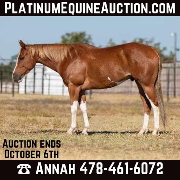 ONLINE AUCTION Place your bids at www.PlatinumEquineAuction.com Starting Bid $3500 Auction ends October 6th, 2024 Need a new saddle? Check out White Rock Saddles on our website or Facebook! Champ, 6 year old, 15.1H, gelding with lots of chrome and great personality! Champ is currently being used as a turn back/ cowboy horse on a working performance horse ranch! Used to gather cows, turn back for the trainer and pleasure rides all along the ranch! Champ is very respectful and loves being around people! Easy to catch, loads in the trailer effortlessly and stands for the farrier amazing! That’s why we call him champ cause he handles everything like one! Champ is located in Weatherford, Texas. Call anytime Annah Turner 478-461-6072. ONLINE AUCTION Place your bids at www.PlatinumEquineAuction.com Starting Bid $3500 Auction ends October 6th, 2024 Need a new saddle? Check out White Rock Saddles on our website or Facebook!