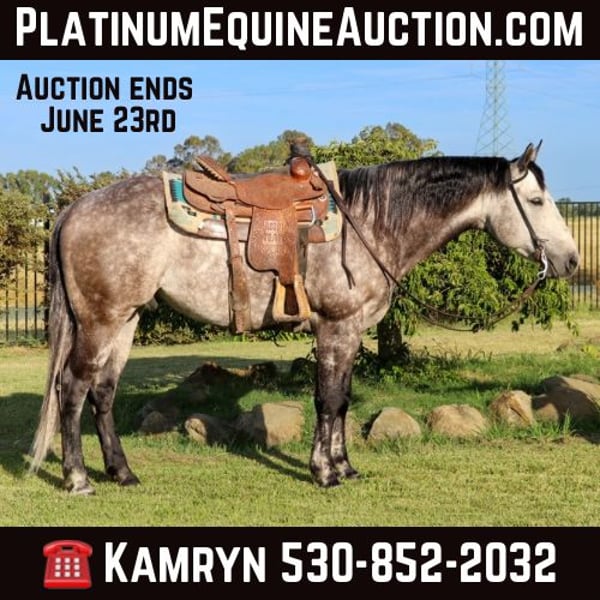 ONLINE AUCTION Place your bids at www.PlatinumEquineAuction.com Starting Bid $3500 Auction ends June 23rd, 2024 Need a new saddle? Check out White Rock Saddles on our website or Facebook! Meet 2 Pac (aka Paco) a 6 year old 15.1 HH gelding. Introducing 2 Pac, affectionately known as Paco, a horse who is truly worth his weight in gold. He is big boned and big feet not petite quarter horse legs. He is as thick as he is tall. Paco is not just a horse; he is a barn favorite with a personality that shines as bright as his name suggests. With his puppy dog loving demeanor, Paco is sure to win your heart and become your best friend. Paco is the embodiment of a horse with heart. He has a super “in-your-pocket” personality, always eager to be near people, showering them with affection. Paco’s loving nature is complemented by his goofy antics that will keep you chuckling and entertained. His presence lights up the barn, and he has won the hearts of everyone around. We will surely miss him at the ranch, but we know he is ready to bring joy and companionship to his new home. Paco is not just a charmer; he’s also exceptionally talented and well-trained. In the arena, Paco is fancy broke with skills that are hard to beat. He has a great stop, impressive spins, flying lead changes, and the ability to collect his head beautifully. He can side-pass with ease, showcasing his versatility and training. Paco has a “been there, done that” personality, making him reliable and trustworthy in any situation. On the trails, Paco is a true gentleman. He handles any task with ease and grace, whether it’s going through water, stepping over logs, or navigating rocky and muddy paths. Paco doesn’t bat an eye at any terrain, making him the perfect partner for all your outdoor adventures. He’s been ridden under city lights and is completely town safe. Cars, honking horns, quads, dirt bikes, joggers, loose dogs, airplanes, and scooters – you name it, Paco has seen it all and could care less. Pacos bravery is unmatched. He’s had flags waved around him, tarps flapping in his face, and he remains unphased. We’ve even roped the sled on him a few times, and he takes it all in stride with ease. Paco has been our go-to horse for gathering cows in the mountains, participating in overnight camping trips, poker rides, beach rides, and everyday trail rides. He’s also been a star in parades, handling the excitement and chaos with over 50 other horses like a pro. Whether Paco is part of a group or out on his own, he remains calm and collected. He can happily go out alone without a care in the world. Paco is more “woah” than “go,” enjoying a relaxed pace as he cruises around town or the neighborhood. His easy-going nature makes him perfect for riders of all experience levels. Paco is a one-of-a-kind horse with a heart of gold and a personality that will make you fall in love instantly. He’s done it all and is ready to bring his special charm to a new home. Don’t miss this opportunity to own a true gem of a horse. Paco is also UTD on shoes, worming, shots, chiro. Contact us today at KW Ranch Kamryn 530-852-2032 to meet Paco in Pleasant Grove, CA and see for yourself why he is such a beloved member of our ranch. He’s ready to be your new best friend and loyal companion, ready for any adventure you can dream of. ONLINE AUCTION Place your bids at www.PlatinumEquineAuction.com Starting Bid $3500 Auction ends June 23rd, 2024 Need a new saddle? Check out White Rock Saddles on our website or Facebook!