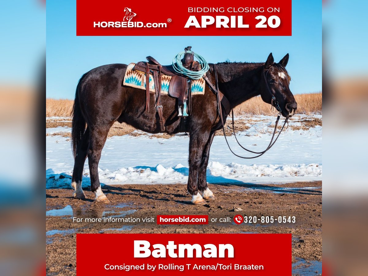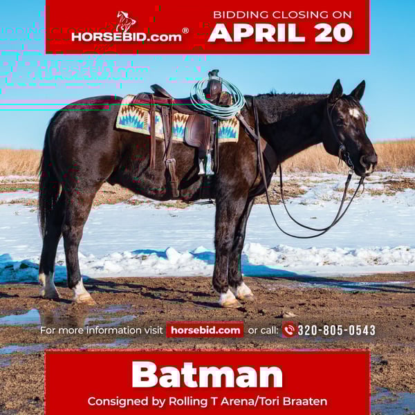 ⚜️𝐭𝐡𝐞 𝓔𝓵𝓲𝓽𝓮 𝐒𝐩𝐫𝐢𝐧𝐠 𝐂𝐥𝐚𝐬𝐬𝐢𝐜⚜️ Happening now thru MONDAY | APRIL 20th - Available EXCLUSIVELY on HorseBid's website! For more details and to register visit: www.Horsebid.com CONSIGNOR CONTACT: Rolling T Arena/Tori Braaten 320-805-0543 LOCATION: Glenwood, MN BREED: AQHA REGISTERED: Yes REGISTERED NAME: EB GENUINE IMPRINT COLOR: Black HEIGHT: 15.2 AGE: 8 GENDER: Gelding EB Genuine Imprint (Batman), a black, 15.2-hand high, 8-year-old gelding, stands at the gate ready for any job. With NRHA-earning pedigree, he’s done it all: pasture roping, ranch rodeos, cow events, barrels, poles, sorting, extreme trail courses, and been a pickup horse. He’s eager yet steady, with stamina to last all day. Since a weanling, he's been easy to train and is built strong. From roping dummies to leading big trail rides, he takes it all in stride. Ready to go any direction - your next adventure awaits with Batman!
