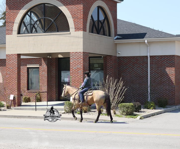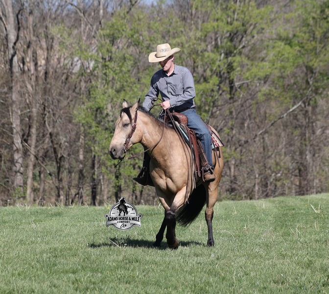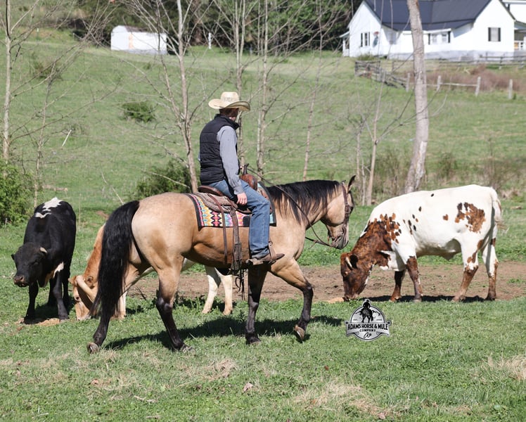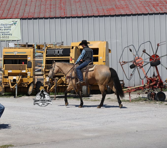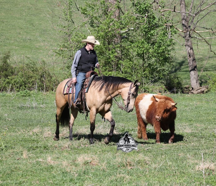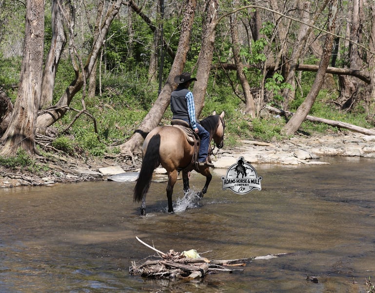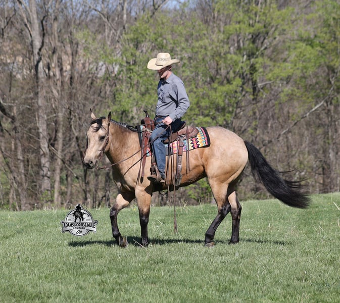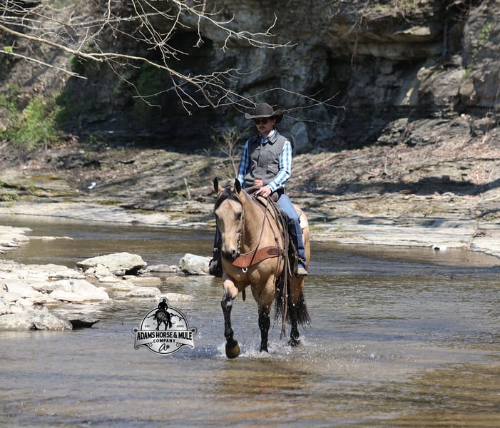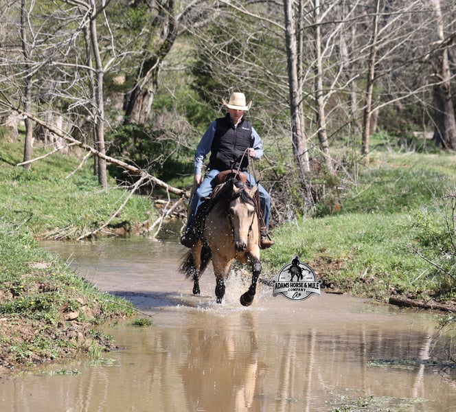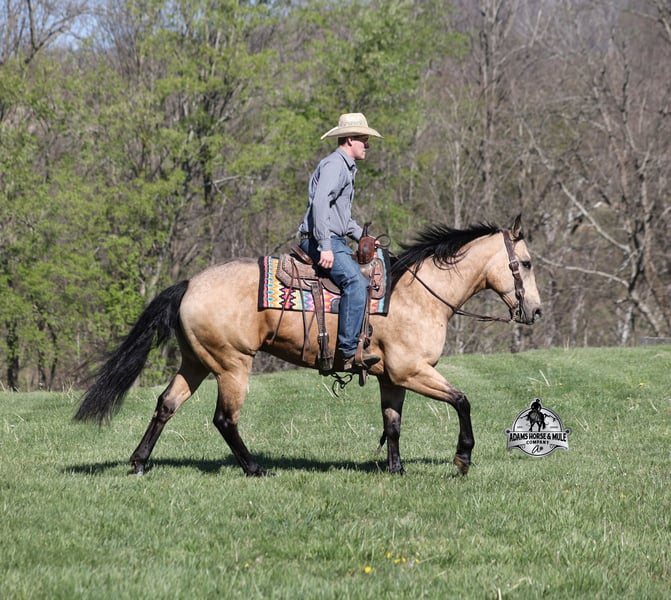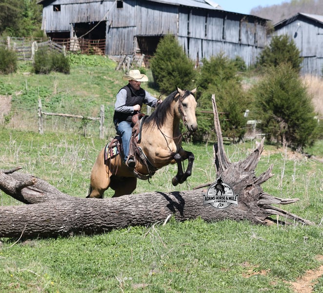 Go to visit our website for more pics and video link at www.AdamsHorseAndMuleCo.com AHAMC has been in the horse business and sold horses over the internet since 2005. We have a long track record of success with hundreds of happy customers. We work hard to match riders with the correct horses and specialize in beginner safe, family friendly horses that have been used and checked out by our family! We can set up transportation anywhere in the US and look forward to working with you. Get your clipboard out and sharpen your pencil, ALL of those boxes are going to get checked when you see Tanner… standing around 15.2H tall and just about as wide, Tanner is a beautiful, 9 year old, gelding, in my favorite color golden buckskin! Not only does he check that box in the looks department, he checks the most important box of all… the mind!! Tanner is as smart and as gentle as they come in that department!!!! He is quiet, gentle and very friendly. He is a horse that any level of rider can get along with and he will take care of his rider. He is everyone’s best friend, has never met a stranger and he is the same horse with time off. He has plenty of experience as he has been used out on the ranch for pasture roping and doctoring. He has been ridden in the arena and lopes slow and easy circles, spins both ways and has a good stop… he has the moves to go along with the good looks! If the ranch work is done and you just want to go for a relaxing trail ride, that is his favorite thing to do… steep slopes, rocky terrain, creeks, logs, ditches… he crosses it all with ease and is never in a hurry, with a group or by himself! Tanner will keep a beginner totally safe even in a bad situation! He is a horse that the whole family will enjoy, he will build his riders confidence levels and is always forgiving. He has been ridden around town, through the bank drive thru and ridden on the highways after dark. He is totally traffic safe and trustworthy. Tanner is the horse that can do any job, ride anywhere, the whole family can ride him and the whole family will love! Looks, Training, Experience, Versatility, Safe, Color, Personality… he truly checks ALL the boxes!!! Call Eric 606-308-2461 for more info.