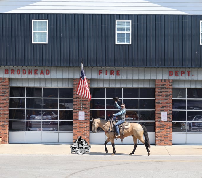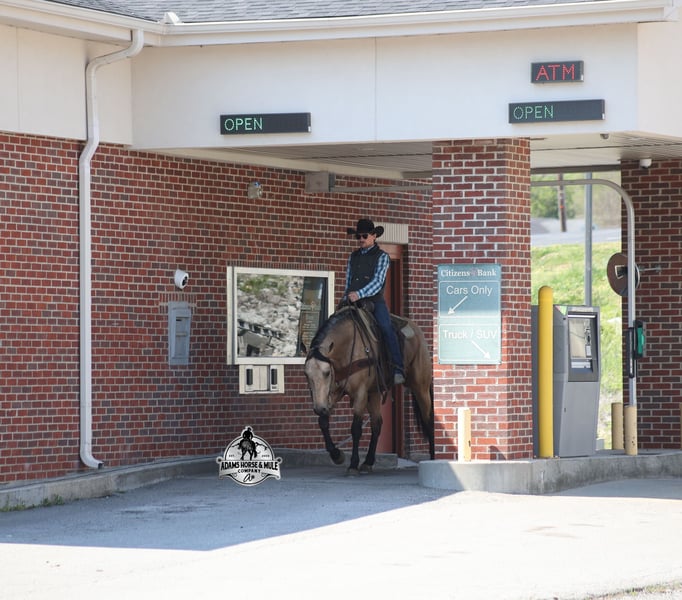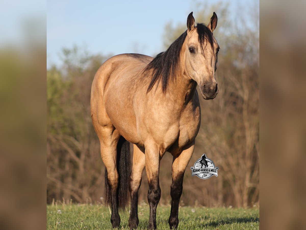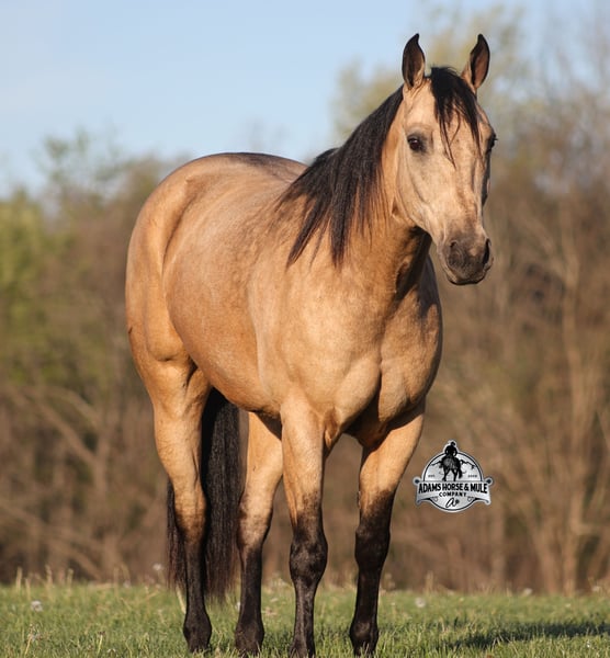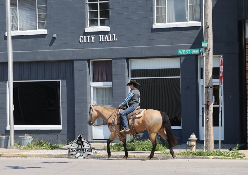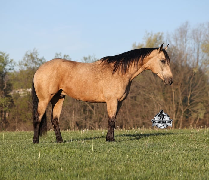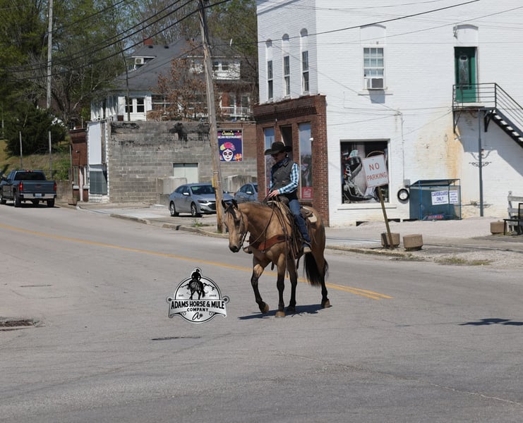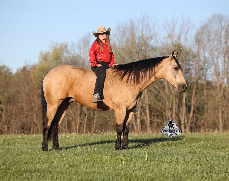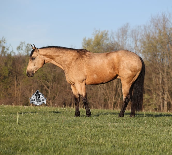 Go to visit our website for more pics and video link at www.AdamsHorseAndMuleCo.com AHAMC has been in the horse business and sold horses over the internet since 2005. We have a long track record of success with hundreds of happy customers. We work hard to match riders with the correct horses and specialize in beginner safe, family friendly horses that have been used and checked out by our family! We can set up transportation anywhere in the US and look forward to working with you. Get your clipboard out and sharpen your pencil, ALL of those boxes are going to get checked when you see Tanner… standing around 15.2H tall and just about as wide, Tanner is a beautiful, 9 year old, gelding, in my favorite color golden buckskin! Not only does he check that box in the looks department, he checks the most important box of all… the mind!! Tanner is as smart and as gentle as they come in that department!!!! He is quiet, gentle and very friendly. He is a horse that any level of rider can get along with and he will take care of his rider. He is everyone’s best friend, has never met a stranger and he is the same horse with time off. He has plenty of experience as he has been used out on the ranch for pasture roping and doctoring. He has been ridden in the arena and lopes slow and easy circles, spins both ways and has a good stop… he has the moves to go along with the good looks! If the ranch work is done and you just want to go for a relaxing trail ride, that is his favorite thing to do… steep slopes, rocky terrain, creeks, logs, ditches… he crosses it all with ease and is never in a hurry, with a group or by himself! Tanner will keep a beginner totally safe even in a bad situation! He is a horse that the whole family will enjoy, he will build his riders confidence levels and is always forgiving. He has been ridden around town, through the bank drive thru and ridden on the highways after dark. He is totally traffic safe and trustworthy. Tanner is the horse that can do any job, ride anywhere, the whole family can ride him and the whole family will love! Looks, Training, Experience, Versatility, Safe, Color, Personality… he truly checks ALL the boxes!!! Call Eric 606-308-2461 for more info.