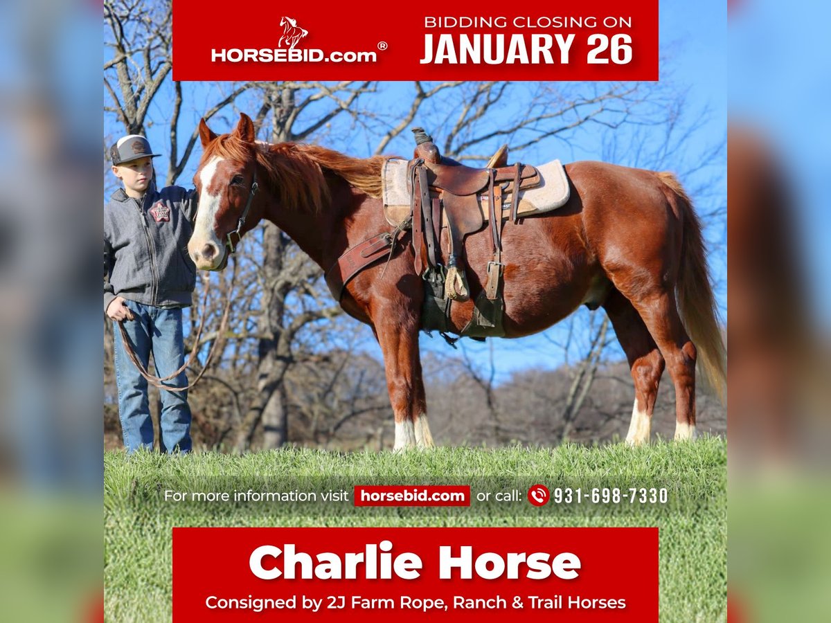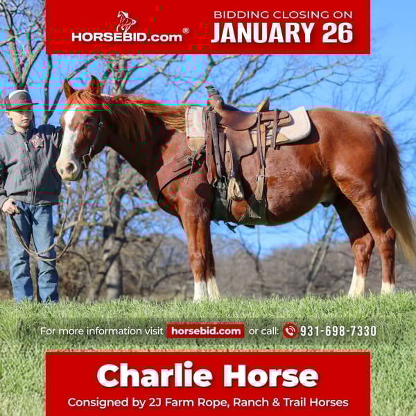 𝐉𝐀𝐍𝐔𝐀𝐑𝐘 ⭐️𝑨𝒍𝒍 𝑺𝒕𝒂𝒓 𝑳𝒊𝒏𝒆𝒖𝒑⭐️ Happening now thru MONDAY | JANUARY 26th - Available EXCLUSIVELY on HorseBid's website! For more details and to register visit: www.Horsebid.com CONSIGNOR CONTACT: 2J Farm Rope, Ranch & Trail Horses 931-698-7330 LOCATION: Culleoka, TN BREED: QUARTER HORSE REGISTERED: No REGISTERED NAME: CHARLIE HORSE COLOR: SORREL HEIGHT: 14 AGE: 9 GENDER: Gelding 🔸This adorable sorrel gelding quarter horse we call ✨CHARLIE HORSE✨ is dependable, safe, and as steady as a rock. He may be “just sorrel”, but God blessed him with a very unique white blaze on his face and 4 white socks, so he’s anything but plain! He is 9 years old, which means that he’s old enough to have plenty of experience under his girth but still has many, many years left to give to his loving family. 🔸Standing around 56” tall, or 14 hands, CHARLIE HORSE is the perfect height for kids but he will also comfortably fit most adults. Rest assured that if you invest in CHARLIE HORSE for your kids, they won’t outgrow him and you will be able to enjoy him as well! 🔸CHARLIE HORSE has been exposed to all the sights and sounds of trail riding. He is happy to either lead or follow and is up for anything you may ask him to do. He’s been around goats, dogs, chickens, turkeys, cats, tractors, four wheelers, segways, electric bikes…just alllll the things! 🔸On the ground, CHARLIE HORSE is kind and patient and loves the attention kids or adults bestow on him. He has a particular fondness for peppermints! He stands calmly when tied, loads and unloads nicely, and gets along with everyone in the herd. CHARLIE HORSE is barefoot and has strong, healthy hooves and never gives his farrier any issues. 🔸CHARLIE HORSE is the kind you snatch up quickly! Our family does more team roping than anything else and he deserves someone to give him all the attention he desires. He’s the perfect horse to explore the trails on, play around in the arena with, or to use to catch cows or check fences. 🔸If you’re looking for safe, sweet and sound - look no further than CHARLIE HORSE! Don’t let him slip away - go ahead and put a bid in on this awesome guy! 🔸CHARLIE HORSE sells sound and with a current Coggins. We would love, and we always advise, for you to come try him out and see for yourself what a great guy he is! Nationwide shipping is available and we would be delighted to help with arranging transport to his new home. 🔸For more info. on CHARLIE HORSE or to schedule a visit to see him at our farm in beautiful middle Tennessee, please call Levi at 931-698-7330.