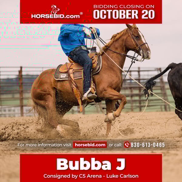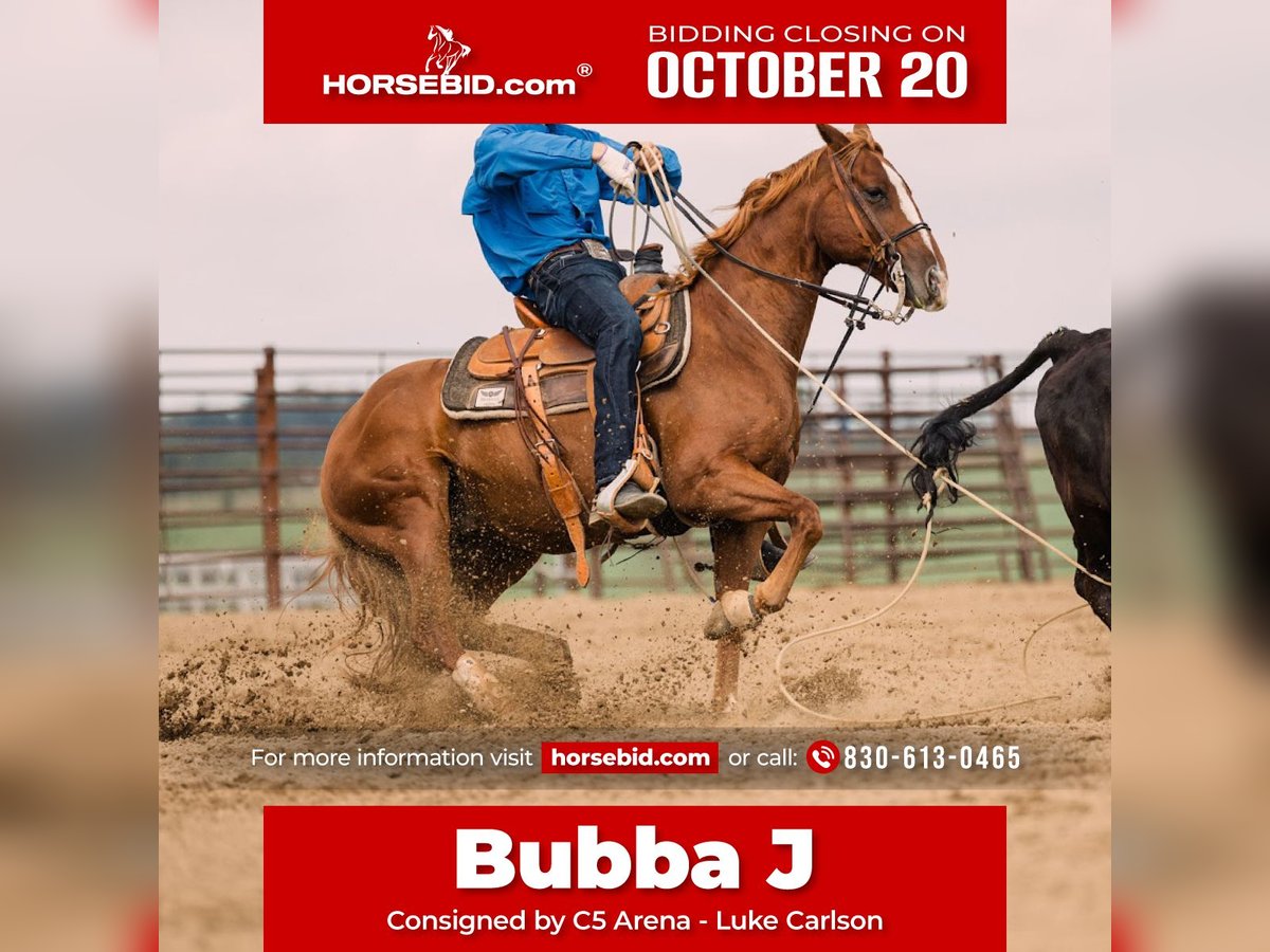 ♦️ 𝐭𝐡𝐞 𝐀𝐌𝐄𝐑𝐈𝐂𝐀𝐍 𝓕𝓪𝓵𝓵 𝓒𝓵𝓪𝓼𝓼𝓲𝓬 ♦️ Happening now thru MONDAY | OCTOBER 20th - Available EXCLUSIVELY on HorseBid's website! For more details and to register visit: www.Horsebid.com CONSIGNOR CONTACT: C5 Arena - Luke Carlson 830-613-0465 LOCATION: Decorah, IA BREED: Quarter Horse REGISTERED: Yes REGISTERED NAME: Bettin On Reminic COLOR: Sorrel HEIGHT: 14.2 AGE: 8 GENDER: Gelding “Bubba J” is an athletic 8 year old sorrel gelding that is handy broke. He stands just over 14.2 hands tall weighing 1100lbs. Bubba J is quick footed, spins, smooth soft loper, really hunts his stop, great minded, and is fun to ride. He is extremely athletic and has been hauled extensively on the heel side. He has been our personal horse and we have won significant amounts of money, and saddles on him. Bubba J will do all aspects of ranch work like pushing, gathering, and sorting cattle. He will go wherever you point him, and is very quick to learn. He doesn’t hesitate to walk through water and goes through all types of terrain. Bubba J is a finished heel horse and started on the head side & breakaway and wouldn’t take much to finish him out. He is extremely cowy with a HUGE stop and is strong to the horn. Bubba J is a horse that is very easy to rope on has all the speed you need, with good rate. He loads easily in the trailer and stands quietly tied. This horse is so special as he is super athletic and has the ability to take you to the next level. Bubba J takes everything in stride and the options are endless for this guy. Big time head, heel or breakaway horse right here! Or he has the talent and ability to go in any direction. We think he would make an outstanding cow horse. Sound with general performance horse maintenance, current on deworming, farrier, and coggins. Call Luke with any questions! (830) 613-0465