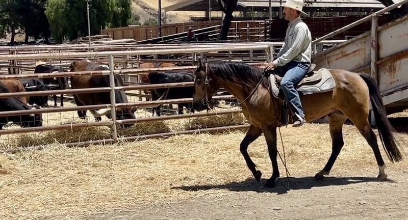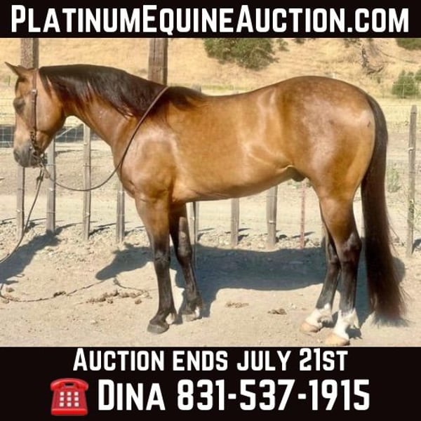 ONLINE AUCTION Place your bids at www.PlatinumEquineAuction.com Starting Bid $3500 Auction ends July 21st, 2024 Need a new saddle? Check out White Rock Saddles on our website or Facebook! Here is the buckskin horse of your dreams standing just under 14.2 HH and 7 years old. He is super friendly and a curious boy. He has the look of a show horse with his gorgeous frame, and long mane and tail. Aspen is super well behaved out on the trail, he will go out alone or with friends. He will cruise town with no nonsense. He has been used at some local shows for sorting and ranch trail. He handles the crowds and loud noises great doesn’t get bothered. Aspen has a lot of cow sense and is easy to gather and work pens on. He has a nice collected head set and lopes beautifully and correct circles. He has a stop to match and starting a nice turn around. This horse is very gentle and easy to handle, tacks up easy and rides right off. He has done amazing with the trail obstacles easy to show new things. He is great going over bridges, tarps, car wash and could care less about the flags. This boy will definitely catch everyone’s eyes with his dreamy color. He is safe and easy to handle and has been ridden from beginners to advanced riders. Aspen will be a great trail partner he loves to go out on adventures. His stylish moves are so comfortable you can ride all day. He will go through water, cross ditches, downed trees, navigate his way through brush and has seen tons of wildlife. He would make a lovely sorting or ranch riding companion. This boy can do it all he is a total gentlemen. Whether you want to dabble in the show pen or cruise the trails Aspen is ready and willing. He has a great friendly demeanor and is always waiting at the gate to meet you. He is current on vaccines, worming and farrier. Aspen rides bareback and in halter with confidence. He is a horse that does well with time off and retains his training. If you have any questions please contact Longhorn Ranch, Dina 831-537-1915 is located in the beautiful Paicines, CA. ONLINE AUCTION Place your bids at www.PlatinumEquineAuction.com Starting Bid $3500 Auction ends July 21st, 2024 Need a new saddle? Check out White Rock Saddles on our website or Facebook!