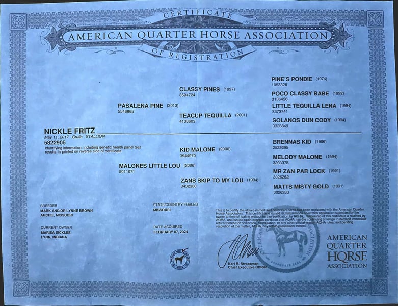 ASTA ONLINE Fai le tue offerte su www.PlatinumEquineAuction.com Offerta iniziale $3500 L'asta termina il 5 ottobre 2025 Hai bisogno di una nuova sella? Dai un'occhiata a White Rock Saddles sul nostro sito web o su Facebook Signore e signori, lasciate che i vostri occhi si posino su un magnifico esemplare che attirerà l'attenzione e ruberà cuori con un solo sguardo. “A Nickle Fritz” è un gelding AQHA registrato, modello 2017, di un elegante colore Grulla, alto 14.3hh. Fritz soddisfa molti requisiti per chi cerca un cavallo da famiglia, da trail o da mostra in ranch. A 8 anni, ha anni di esperienza alle spalle, offrendovi la stessa onestà e maturità in ogni cavalcata, indipendentemente dal tempo di riposo che gli viene concesso. Fritz è adatto a quasi tutti i livelli o età di cavalieri. Qualsiasi adulto o bambino esperto si troverà meravigliosamente in sintonia con lui; raccomandiamo che un bambino principiante sia in un ambiente controllato con supervisione quando lo monta, poiché non abbiamo personalmente lasciato i bambini liberi con lui. Fritz sarebbe un'aggiunta fenomenale per chi desidera partecipare alle classi di cavalli da ranch. Ha esperienza nei sentieri; sia che si tratti di cavalcare attraverso pianure aperte o attraverso fitte foreste. Attraverserà fossati, acqua, legname caduto, e lo farà tutto con una grazia disinvolta. Che tu lo monti in testa, in mezzo o in fondo al gruppo, Fritz cavalcherà tranquillamente. Cavalca anche da solo senza alcun problema. Fritz è abituato a cavalcare lungo strade trafficate e attraverso le strade principali del nostro piccolo paese. Non è infastidito dal traffico o dai pedoni, è persino abituato ai giochi equestri che si trovano intorno ai parchi giochi. Una cosa che amo assolutamente di Fritz è quanto sia agile; puoi vedere che pensa a dove posizionare ogni zampa ed è totalmente consapevole della posizione del suo corpo. Fritz ha un bel trotto allungato, transizioni fluide, una vera neck rein a una mano e un facile arresto. Eseguirà cerchi bellissimi e uniformi; raccogliendo i suoi comandi correttamente con una partenza fluida. Fritz passerà di lato, aprirà e chiuderà cancelli, e ha un giro molto corretto. Può essere montato senza sella e persino senza briglia – sia che tu sia nell'arena, sulla strada principale, o nei vasti campi aperti. Fritz è stato trasportato molto e ha visto molti luoghi, aiutandolo a diventare esperto e a sentirsi a suo agio lontano da casa. Si carica e viaggia con facilità. Fritz è meraviglioso per il maniscalco e sta perfettamente in piedi per essere ferrato. È anche facile da lavare. Fritz è a suo agio sia in box che in pascolo, e va d'accordo bene con i compagni di pascolo. Nella sua documentazione è incluso un risultato del test genetico a 5 pannelli, tutti negativi (5 pannelli n/n). Fritz è un vero piacere da avere intorno, e so che lo apprezzerai tanto quanto l'ho fatto io. Se hai domande, o desideri incontrare Fritz prima della fine dell'asta, chiama Edwin al 319-283-0616. ASTA ONLINE Fai le tue offerte su www.PlatinumEquineAuction.com Offerta iniziale $3500 L'asta termina il 5 ottobre 2025 Hai bisogno di una nuova sella? Dai un'occhiata a White Rock Saddles sul nostro sito web o su Facebook