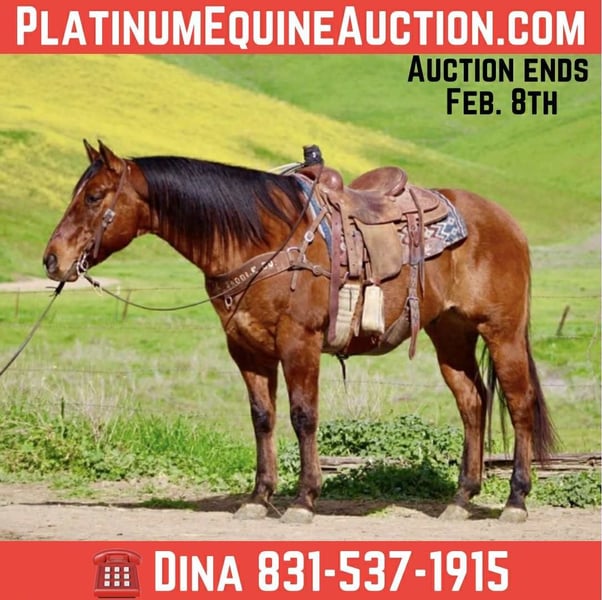 ONLINE AUCTION Place your bids at www.PlatinumEquineAuction.com Starting Bid $3500 Auction ends February 8th, 2026 Need a new saddle? Check out White Rock Saddles on our website or Facebook Bravo – The Kind You Enjoy Every Ride Some horses make you smile the first time you see them. Bravo keeps you smiling every time you ride him. Meet a 9-year-old, 15-hand line-back buckskin dun gelding with classic good looks, a kind mind, and the kind of ride that makes you want to saddle up again tomorrow. Bravo is friendly, sweet-natured, and easy to be around. He has a quiet confidence about him that shows up whether you’re catching him in the pasture or riding him out. Built right with good bone and balance, he wears his bold dorsal stripe and buckskin dun color with style. Under saddle, Bravo is handy and comfortable to ride. He carries a nice rein, has a great stop, and backs willingly and correctly. He’s smooth through his gaits, easy to guide, and responsive without being demanding — the kind of horse that makes riding feel effortless. Bravo has been ridden around cows and handles ranch-style work with ease. He’s also been exposed to obstacles, including flags and tarps, and takes everything in stride. New situations don’t faze him; he stays calm, sensible, and willing, making him enjoyable in a variety of settings. On the ground, Bravo is a pleasure. He’s easy to handle, enjoys attention, and fits seamlessly into daily routine. Whether you’re riding in the arena, out on the trail, or doing a little bit of everything, Bravo is the kind of gelding that makes each ride a good one. If you’re looking for a horse with looks, brains, and a great attitude — and one that keeps things fun without any fuss — Bravo checks all the boxes. Location: Paicines, California Contact: Dina -Longhorn Ranch Phone: 831 • 537 • 1915 Shipping available nationwide with reputable haulers ONLINE AUCTION Place your bids at www.PlatinumEquineAuction.com Starting Bid $3500 Auction ends February 8th, 2026 Need a new saddle? Check out White Rock Saddles on our website or Facebook