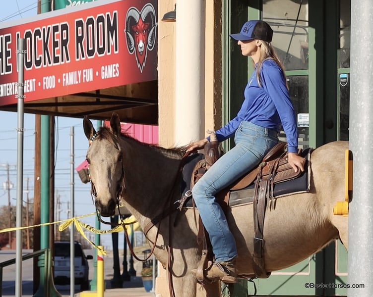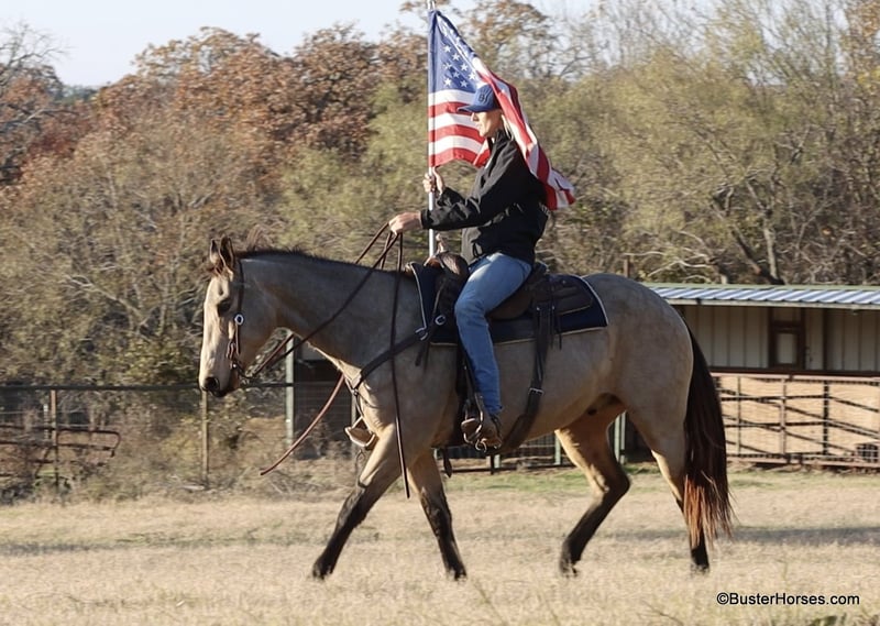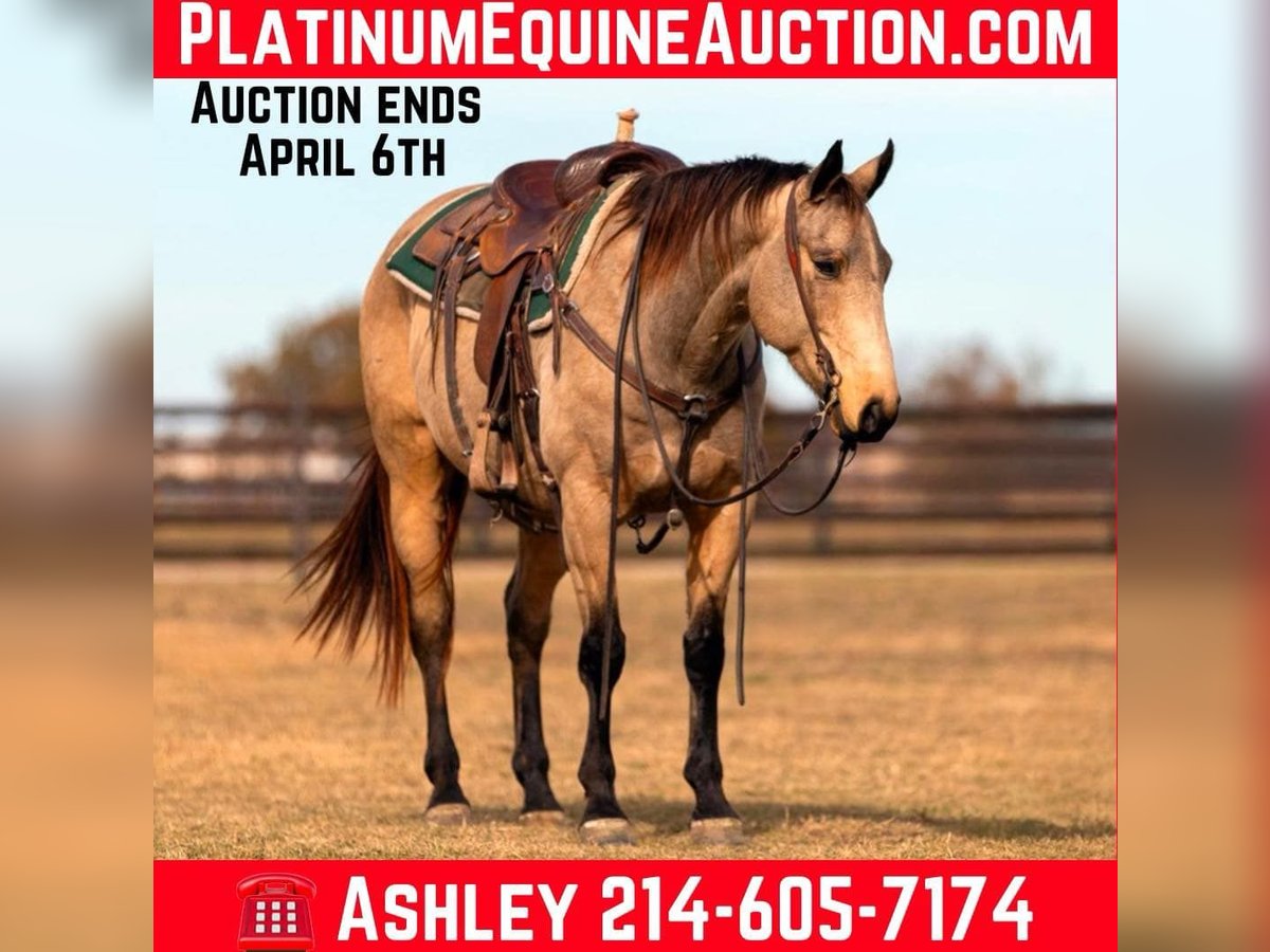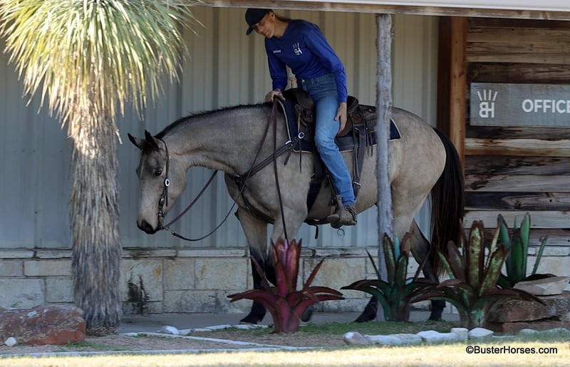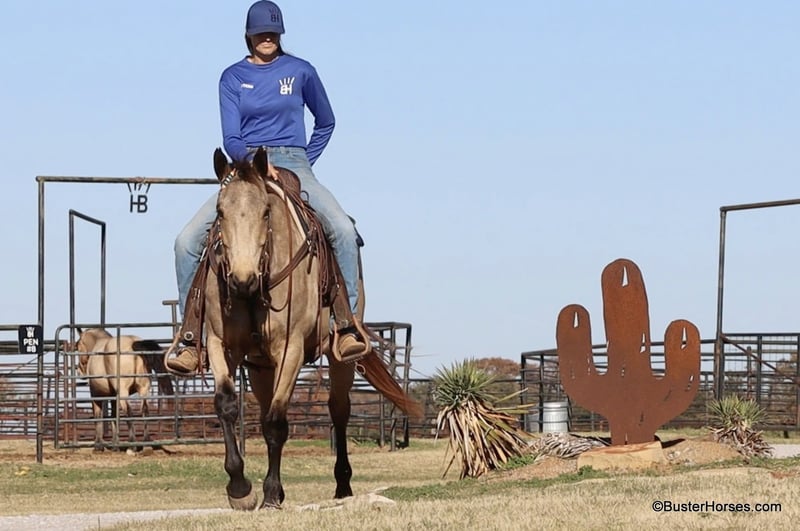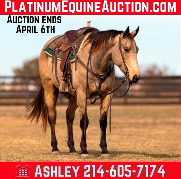 ONLINE AUCTION Place your bids at www.PlatinumEquineAuction.com Starting Bid $3500 Auction ends April 6th, 2025 Need a new saddle? Check out White Rock Saddles on our website or Facebook! D Bar Twist A Top aka Jackrabbit is a 15H, 2017 Model registered AQHA Buckskin gelding with a pedigree that anyone will love! Hi sire is Dun It With A Twist who is by the Legendary Hollywood Dun It, he has Genuine As Diamonds and the Famous Peppy San Badger on his papers as well. Jackrabbit is seasoned ranch gelding that has been all over – he’s been used on big ranches in New Mexico, Colorado, and in Texas – and he has done his job well with all different levels of riders on him. He is extremely smooth gaited and has the most tolerant kind take-care-of-you personality, he aims to please PERIOD in all situations. He has an incredibly solid, mature-beyond-his-years disposition. He is an own son of Dun It With A Twist and he is out of an old-school Genuine Doc Peponita Pine X Watch Joe Jack bred mare. This cool gelding got his name from his ridiculous endearing little/but large, can’t-help-but-love-em ears – they are unique and adorable!! He is like an all-terrain vehicle!!! He literally can go up, over, into, and through almost anything you point him at – and he does it gracefully, willingly, and boldly while still also being careful where he puts himself and his rider. He absolutely loves going into town, he genuinely enjoys seeing everything new and meeting the people. He hops right on the trailer and has absolutely no vices or bad habits. He will ride out alone willingly and has many many miles riding out in the open alone. He is easy to mount and dismount and is extremely uncomplicated to ride. He has a nice handle on him, you can ride him anywhere with one hand and he travels comfortably at all three gaits. He easily picks up either lead, has a great stop, back up, and turn around on him. He is naturally very balanced, low headed, and relaxed. He has worked more gates than you can count and knows his job there. He has sorted in the actual sorting pens for years, and would make a great horse for the sorting or penning competitions – he’s done that job in real life, for hours and hours for several days and he knows the deal! He has also been lightly started in the roping pen and is just the right age to start hauling and seasoning for that job. He does have some speed and run when you ask him, and would make a great all-around Junior, High School, or College rodeo horse. Has a ton of natural rate and stop, and plenty of cow – would quickly make a breakaway horse as well. He is a flat, level, and cute enough mover to also be very capable of playing around at the local entry level ranch horse competitions, or go to 4-H and be competitive. A gelding this versatile, athletic, seasoned – plus kind natured, and this perfect age – plus BUCKSKIN, is not a gelding we get every week. Come check him out anytime! Jackrabbit was just recently maintained by the chiropractor, the equine dentist, and was just shod by the farrier, wormed, and he has a fresh Coggins. We can quickly and easily get travel health papers drawn up anywhere you need him to go. He will arrive to his new owner with all cares in order and ready to do whatever job you have for him. Please feel free to reach out to us to come ride and try Jackrabbit, we would love to meet you in person and show him to you. We are conveniently located only an hour from a large centrally located international airport, making coming to see him possible no matter where you live! Please check out Buster Horses / Buster Ranch our past customer reviews on Google, Facebook, and our own website. And please go to Jackrabbit’s web page for more information, pictures, and for additional videos: BusterHorses.com/Jackrabbit BusterHorses.com Call Ashley with Buster Horses 214-605-7174 for more info. Located in Weatherford, TX. ONLINE AUCTION Place your bids at www.PlatinumEquineAuction.com Starting Bid $3500 Auction ends April 6th, 2025 Need a new saddle? Check out White Rock Saddles on our website or Facebook!