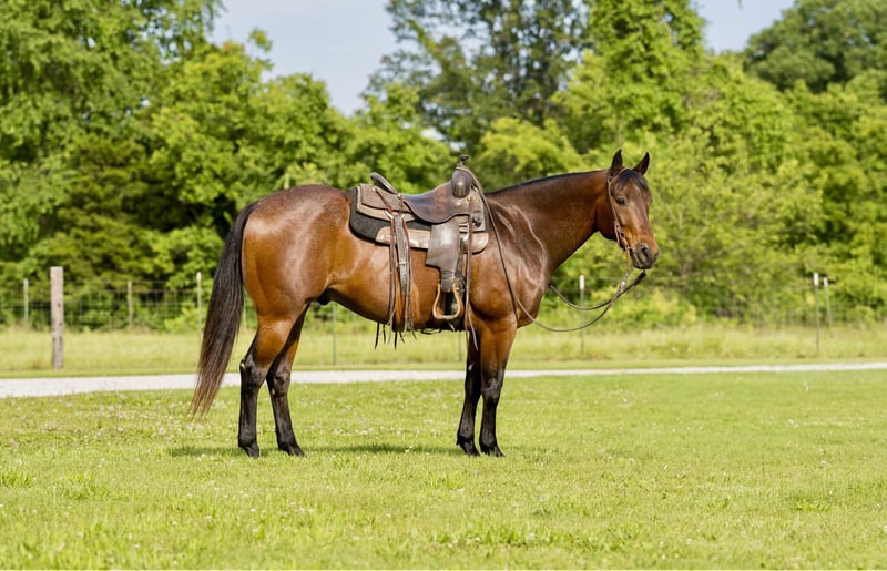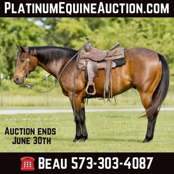 ONLINE AUCTION PLACE YOUR BIDS AT PLATINUMEQUINEAUCTION DOT COM $3500 STARTING BID AUCTION ENDS JUNE 30TH Cinch Is 15 hands tall, 7 year old registered AQHA, gelding that is full of all the shape in the world, and has the prettiest head you could put on a horse. Cinch is a bay roan with all the bone and muscle, he is built to last. Cinch is not only easy to wake up to in the morning with his looks but is an absolute pleasure to ride and be accompanied by. He has the strongest personality ever. He is always the first one to be at the gate ready to be saddled or brushed no matter how the day before went. When it comes to a true all-around gelding, Cinch checks all the boxes. He has been used on a yearling operation roping, sorting, doctoring and tending to daily ranch chores. He does all these tasks safely, willingly, and with ease. Cinch has also spent many long days and early mornings at the feedlot shipping and pulling cattle. He is no stranger to being saddled early in the morning and rode all day. When it comes to being gentle and safe, Cinch is your man. Whether you are a beginner or advanced rider, he never tries to outthink you and is always willing to get along. Cinch is the type of horse you can have tied in the barn and have the kids running around and not have to worry about something spooking him or any kind foolishness. Cinch would make a very competitive ranch trail horse with all his real-life exposure to crossing water, logs, bridges, dragging calves, and up and down rough terrain this phenomenal gelding would perform all the tasks in the show ring. Cinch is also well rounded in the arena he is as smooth as glass in all his gaits, he picks up both leads and loves the word whoa! He is one handed broke and very easy to operate. This well-rounded gelding also does well with time off whether you ride him every day or once a month Cinch remains the same easy minded safe reliable horse every trip out of the barn. For more information please call or text Beau Slaughter 573-303-4087. Located in Canyon, TX.