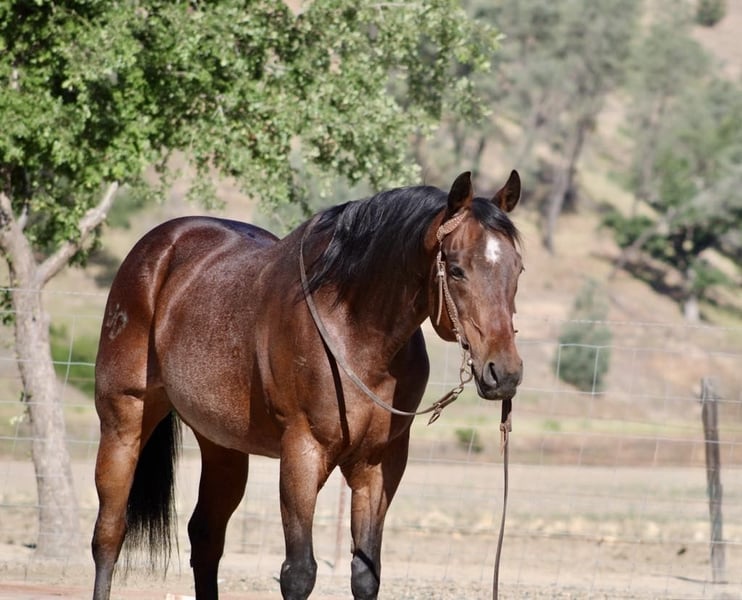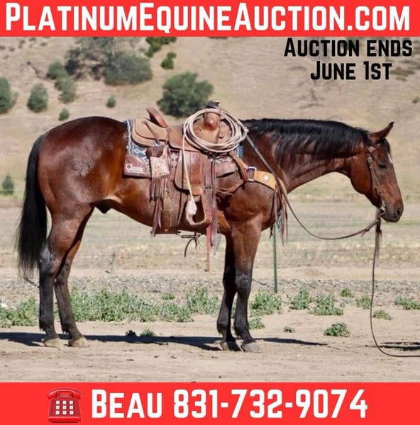 ONLINE AUCTION Place your bids at www.PlatinumEquineAuction.com Starting Bid $3500 Auction ends June 1st, 2025 Need a new saddle? Check out White Rock Saddles on our website or Facebook! Meet Ducky, the charming bay roan gelding standing at 15.1 hands and 8 years old! This sweet guy is a total gem, with a smooth gait that makes riding a breeze. He’s got a great neck rein and handle, so you can turn and stop him effortlessly in the arena. Ducky’s been there, done that when it comes to ranch work, and he’s a pro at gathering, branding, and doctoring cattle. Out on the trails, Ducky’s in his element. He knows his stuff and can handle any terrain like a champ, from logs to water to wildlife. He’s even been to the beach for some fun trail rides! Plus, Ducky’s a natural at ranch rodeos and isn’t fazed by flags, tarps, or balls. He’s tackled all sorts of obstacles, like bridges, tires, and pool noodles, with no problem. Ducky’s a breeze to handle – he ties, clips, and hauls like a dream. He’s also great for the farrier and vet visits. This no-nonsense horse is perfect for riders of all levels, from beginners to advanced. If you’re looking for a safe, reliable, and all-around awesome horse, Ducky’s your guy! Contact Beau Mandela 831-732-9074 located in King City, CA, for more info on this charming boy. ONLINE AUCTION Place your bids at www.PlatinumEquineAuction.com Starting Bid $3500 Auction ends June 1st, 2025 Need a new saddle? Check out White Rock Saddles on our website or Facebook!
