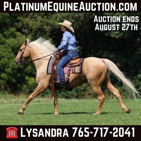 ONLINE AUCTION Place your bids at www.PlatinumEquineAuction.com Starting Bid $3500 Auction ends August 25th, 2024 Need a new saddle? Check out White Rock Saddles on our website or Facebook! A Zans Olen Jack is a stout built Golden Palomino Gelding. He is standing 15.1hh and he is a 2017 Model Registered AQHA Gelding. He is well bred going back to Zan Parr Bar and is a rare find with Two Eyed Jack still listed on his pedigree. Zan is a do it all kind of horse! He can go out and hit the trails and just cruise along slow and easy. He rides with his head low and will keep a loose/draped rein. He has been exposed to all kinds of wildlife. He will go up or down steep slopes, across deep creeks, over downed trees, and over all types of rough terrain while still being sure footed. He has been ridden through town and is safe in traffic is not spooky. He has been started on the roping dummy and is doing a good job tracking it. He knows his way around the ranch and has plenty of cow sense. He has a smooth jog, a VERY VERY nice easy to set lope, a good stop, turns a circle both ways and backs with ease! Zan is an excellent horse for anything from trail to ranch work and is pleasure to be aorund! We are located in Brodhead, KY. Feel free to call Lucky 13 Equine Lysandra 765-717-2041 with any questions. ONLINE AUCTION Place your bids at www.PlatinumEquineAuction.com Starting Bid $3500 Auction ends August 25th, 2024 Need a new saddle? Check out White Rock Saddles on our website or Facebook!