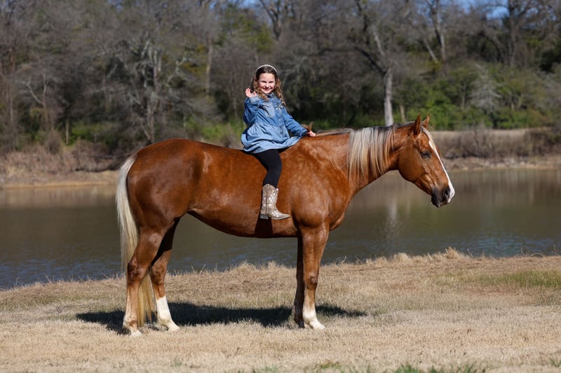 ⚜️𝓽𝓱𝓮 𝐆𝐎𝐋𝐃 𝓢𝓮𝓵𝓮𝓬𝓽⚜️ Happening now thru MONDAY | MARCH 23rd - Available EXCLUSIVELY on HorseBid's website! For more details and to register visit: www.Horsebid.com CONSIGNOR CONTACT: MM Ranch 469-318-1902 LOCATION: Forney, TX BREED: AQHA REGISTERED: Yes REGISTERED NAME: KATIE ROSE BY LL COLOR: Palomino HEIGHT: 15.1 AGE: 9 GENDER: Mare 🎤👱🏻♀️This is our dear sweet “Dolly Partner”!!! Yes we know Dolly Parton but it’s not to be confused with our sweet Dolly Partner!! (My 4 year old niece absolutely loves Dolly Parton but thinks her name is Dolly Partner cause she is a cowgirl!! I mean it makes sense. So it stuck and here is Dolly Partner. It’s the cutest thing ever to hear call her that. She loves her Dolly Partner.) 🎼👱🏻♀️Our sweet Dolly Partner is worthy of the superstar name cause she is truly ONCE IN A LIFETIME SUPERSTAR!! Absolutely worth her weight in gold!! 🌟 She is a AQHA registered stunning golden dappled palomino mare with the prettiest silver mane and tail. She is just 9 yr old and stands 15.1 hands tall. She is one of those impossible to find BOMBPROOF OLD FASHIONED FANCY BROKE ONES plus has the sweetest willing to please personality. She rides the very best. Of course she has all the fancy buttons to spin around and slide to a stop. But she will go as fast or as slow as you want her to go. She is the kind you can really enjoy riding and know you can’t screw up. She is ABSOLUTELY SAFE and BROKE for anyone to ride. If you can sit on her you can ride her no matter your riding level or age. I MEAN ANYONE CAN RIDE HER and ABSOLUTELY DO ANYTHING THEY WANT ON HER. You can ride her once a month a once a year and she is the same. You can catch her fresh out of the pasture and go. Dolly does not need to be tuned up or warmed up. Dolly stands perfect to be saddled and mounted. She will let you use a mounting block, fence, or bucket to get on and off. SHE DOES NOT HAVE ANY BAD HABITS OR QUIRKS. She is not scarred of anything, will not spook out on the trail. She will cross water, cross bridges, has been rode in every kind of terrain. She is the true definition of a bombproof safe for the whole family horse. We want to find Miss Partner an amazing home. This super sweet loving mares deserves it!!! 🎤👱🏻♀️She is a super easy keeper. Requires no maintenance of any kind. No special feed or supplements. She can go bare foot or put shoes on her. She has excellent hooves. She gets along great with other horses. She is not mean to other horses or marish. You can stall her or turn her out. Doesn’t matter to her. She sells 100% sounds with no issues. She did have a pre vet evaluation done included in the pictures. If you have anymore questions about her feel free to call. We would love to visit with you about her. We can help you arrange shipping anywhere. She is up to date on all vaccinations, worming, had her teeth checked, feet. She is ready to go to her new home to be loved and enjoyed. Don’t miss out on the one. These type amazing horses are sure hard to find.