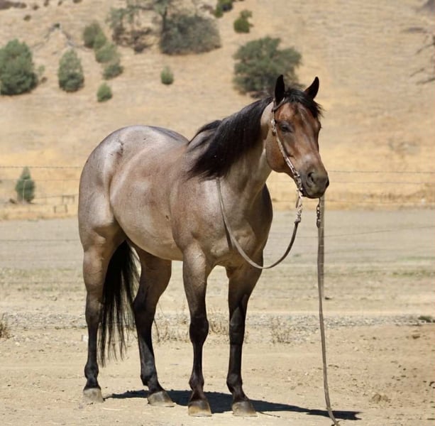 ONLINE AUCTION Place your bids at www.PlatinumEquineAuction.com Starting Bid $3500 Auction ends September 14th, 2025 Need a new saddle? Check out White Rock Saddles on our website or Facebook Blu Tough – The Breathtaking Blue Roan With a Mind to Match. They say a good horse will take you places, but a great one makes you enjoy the ride — and Blu Tough is that kind of gelding. This 2017 AQHA registered blue roan stands 15.1 hands and is built the way a horse ought to be: big-boned, with shape and steady, with that rich blue coat that’ll turn heads every time he steps out of the barn. Blu isn’t just a pretty face — he’s the kind that makes the job easier. He’s been used gathering cattle, started in the branding pen, and will pick his way through brush, rocks, creeks, or mud like he’s done it a thousand times. Point him at a hill and he’ll mosey up it with the same calm stride he always carries. Take him down the road, and he’ll stroll through traffic like he owns it. He doesn’t get bothered leaving the herd, whether in a group or heading out alone — Blu enjoys a solo stroll just as much as riding with company. He’s quiet, no-drama, and steady in every setting. Toss him an obstacle course, and he’ll handle it with the same quiet confidence — bridges, pool noodles, tarps, dragging, tires, you name it — Blu makes it all look like no big deal. And here’s the best part: he’s just plain enjoyable to ride. Blu has a slow, easy pace that makes every trip a pleasure, whether you’re polishing him up in the arena or just out for a relaxing ride. Soft in the bridle, smooth in his gaits, and always willing, he’s the kind of horse most anybody can get along with — steady enough for a casual rider, handy enough for someone who wants to go on and do more. His papers are just as sharp as his looks — Corona Cartel and Hancocks Blue give him the foundation, the athleticism, and the cow sense. What sets him apart is how that pedigree shows up in real life: strong, willing, and dependable, with the kind of versatility that makes him a fit for both work and play. On the ground, Blu is a gentleman. He’ll load himself in the trailer, stand tied, bathe, clip, shoe, and never fuss. He’s easy to catch, easy to haul, and a pleasure to have in the barn. He also gets along well with other horses, whether he’s in a stall or turned out in the pasture — simple to keep and always good company. There are plenty of pretty blue roans out there, but Blu Tough is the rare kind that’s as dependable as he is beautiful. The kind that makes work easier, trails more fun, and turns every ride into a memory you won’t forget. Blu is ready to become part of someone’s family — the kind you’ll be excited to saddle up day after day. Located in Paicines, CA. Call/Text Dina with Longhorn Ranch 831-537-1915. ONLINE AUCTION Place your bids at www.PlatinumEquineAuction.com Starting Bid $3500 Auction ends September 14th, 2025 Need a new saddle? Check out White Rock Saddles on our website or Facebook