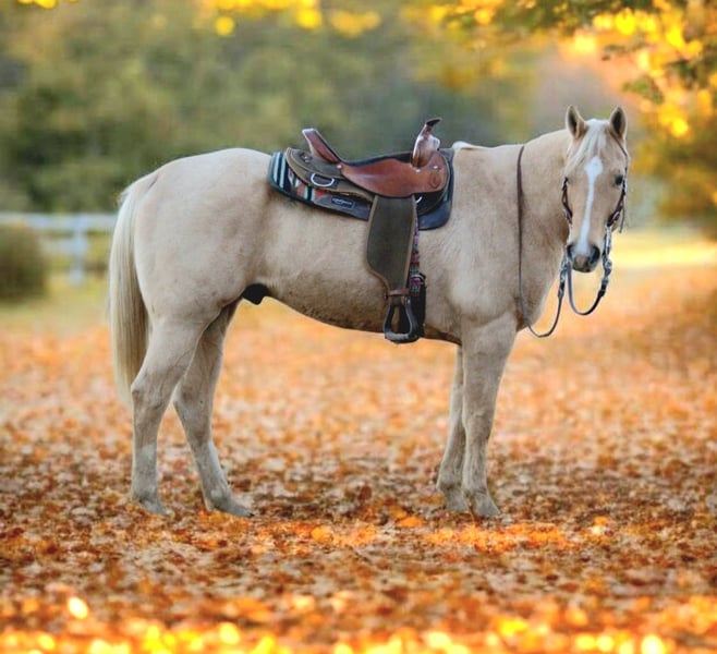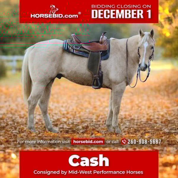 ⚜️ 𝓽𝓱𝓮 𝐇𝐨𝐫𝐬𝐞𝐦𝐚𝐧'𝐬 𝓢𝓱𝓸𝔀𝓬𝓪𝓼𝓮⚜️ Happening now thru MONDAY | DECEMBER 1st - Available EXCLUSIVELY on HorseBid's website! For more details and to register visit: www.Horsebid.com CONSIGNOR CONTACT: Mid-West Performance Horses 260-908-5687 LOCATION: Saint Joe, IN BREED: Quarter Horse REGISTERED: Yes REGISTERED NAME: DS A Splash Of Gold COLOR: Palomino HEIGHT: 15.2 AGE: 8 GENDER: Gelding "DS A Splash Of Gold" a.k.a. "Cash" is a 2017 model Quarter Horse Gelding. Weighing in around 1,300 pounds. Cash is 15.2 hands high and has a very shapey, stout build. This stunning Palomino trail horse has the kind of steady, reliable temperament everyone hopes to find. He’s confident in open country, sure-footed on rocky terrain, and never in a hurry to spook. Whether you’re riding alone or with a group, he settles right into a comfortable rhythm and takes care of his rider every step of the way. This is the kind of partner you can relax on and truly enjoy the ride. If you’re searching for a safe, sweet, golden trail partner, this Palomino is everything you could want. He’s patient, forgiving, and happy to tote around riders all day. He handles obstacles, water, dogs, traffic, and new environments with calm confidence. His gentle disposition and smooth gaits make him a favorite for riders wanting a trustworthy, enjoyable horse to explore the outdoors with. Cash is a seasoned trail horse who knows his job and does it well. He has countless miles under saddle and handles rough terrain, steep climbs, and unfamiliar trails with ease. He loads, ties, stands for mounting, and rides off quietly every time. Soft in the bridle, responsive to your leg, and is always willing. His golden coat and white mane turn heads everywhere he goes, but it’s his solid trail manners that make him unforgettable. He stays slow and steady but will kick it up a notch for those who want to ride English. This horse is a dependable and enjoyable partner in the arena, with smooth, balanced gaits and a willing, responsive attitude. He picks up his leads cleanly, moves off the leg, and stays soft in the bridle, making him a pleasure to school. Whether you’re practicing transitions, working patterns, or polishing lateral movements, he stays focused and eager to please. He’s confident in new settings and strange arenas, consistent in his work, and suitable for riders who want a horse that’s both honest and capable in the arena. Come check him out at Mid-West Performance Horses! Contact April