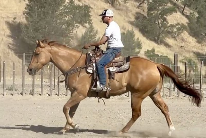 ONLINE AUCTION Place your bids at www.PlatinumEquineAuction.com Starting Bid $3500 Auction ends June 23rd, 2024 Need a new saddle? Check out White Rock Saddles on our website or Facebook! Poco Blessed Trinity is a registered AQHA 2017 model Red Dun gelding with unique tiger striped legs. Poco is a solid 16HH, he is a strong stout made foundation quarter horse. He is super sweet, extremely gentle, and well trained with a loyal temperament. He is one that you can throw the reins to and he will walk low headed anywhere you want to go. He is extraordinarily intelligent, faithful, and obedient. He is calm and relaxed in all circumstances, including new territory and unfamiliar surroundings. He will lope nice circles and has a gorgeous jog that is so comfy. His canter is collected and easy to sit. He has a big stop, he backs up, and moves off of leg cues. He will ride bridleless, bareback and listens to leg cues. He has done some local shows in pleasure and ranch trail classes and he was superb. He will cross all depths of water with confidence and he trail rides out alone courageously without hesitation. He has been to town with heavy traffic surrounding him and is a gentlemen. He is surefooted and picks his way through rocks. Everywhere he goes he catches the attention of everyone with his stunning looks. He’s versatile, extremely safe, true, and sincerely aims to please his rider. He loves attention, comes right up to you, and has the personality of a big ole puppy dog. He is polite, well mannered, and very pleasant to be around. Poco stands for tacking up, and you can mount from either side. He bathes, loads and unloads quietly, and stands tied for any length of time. He is an excellent choice for someone wanting all his great personality traits and the training to make him a top notch horse. Poco is easy to clips. He ties in cross ties and super for the farrier. He has been out to gather cattle, sort pairs, load trucks and is great in the branding pen. He is a great asset to any ranch operation. Poco is one you can put the most timid rider on and he will babysit them. Poco will fit the whole family from the most beginner rider of the family to the most experienced. For more information contact Longhorn Ranch Dina 831-537-1915 Located in Paicines CA. ONLINE AUCTION Place your bids at www.PlatinumEquineAuction.com Starting Bid $3500 Auction ends June 23rd, 2024 Need a new saddle? Check out White Rock Saddles on our website or Facebook!