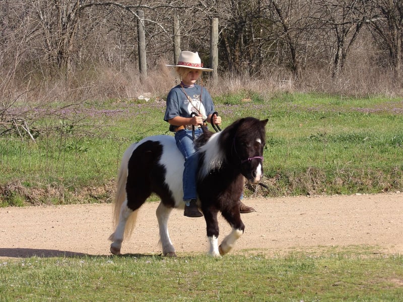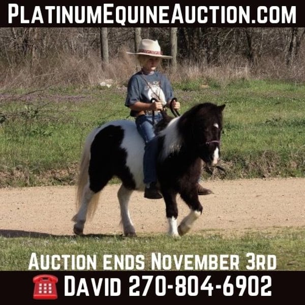 ONLINE AUCTION Place your bids at www.PlatinumEquineAuction.com Starting Bid $3500 Auction ends November 3rd, 2024 Need a new saddle? Check out White Rock Saddles on our website or Facebook! Sallie Mae is a 7-year-old 37 inch mare pony. This little gal is a beautiful black and white paint babysitter. She has a gentle – friendly nature and is always the first one to you in the pasture. Sallie is safe for any child and is always well behaved in every situation. Our six year old daughter can catch, groom, saddle, ride, and drive her all by herself, without any issue. She can handle all four of her feet safely. Sallie has been in parades, playday events, grand entries in rodeos, trail rides, and she will keep up with the big horses all day long. Our daughter trained her on pee-wee barrels and poles. Sallie knows her patterns well. Even after trotting or loping the barrels, Sallie slows back down and walks away on a loose rein, calm and quiet, which makes her the perfect pony for small kids starting out. Sallie is also broke to drive. She will stand patiently to be harnessed, and hooked to the cart, and will walk off quietly. She has a slow easy trot and with a couple clucks she will get right up in a road gear and long trot on down the road. She is traffic safe and super easy to drive! She is soft in the bit, easy to turn, and to stop. Her confidence on the trails is what makes her a true babysitter. She is slow to go down hills, easy to handle, with no problem keeping up with the big guys. Our daughter rides her bareback and with a saddle. Bess and her friends have been over and under her in every way you can imagine, Sallie is for sure a SAFE pony. No matter if you ride her everyday or once a month, she is always sweet, gentle, and safe. She is familiar with dragging empty jugs at the end of a string, she doesn’t mind the swinging of a rope, and Sallie will push roping steers down the alley to the chute. There is not much this little gal can’t do. For any questions about Sallie text or call David Borntreger 270-804-6902 Located in Antlers, OK. ONLINE AUCTION Place your bids at www.PlatinumEquineAuction.com Starting Bid $3500 Auction ends November 3rd, 2024 Need a new saddle? Check out White Rock Saddles on our website or Facebook!