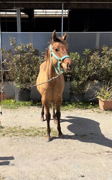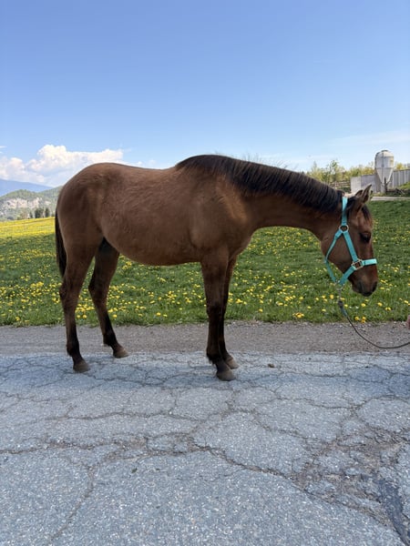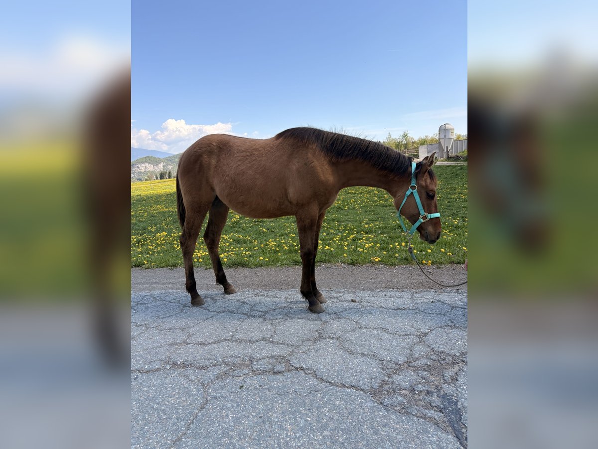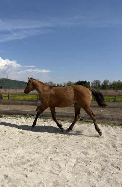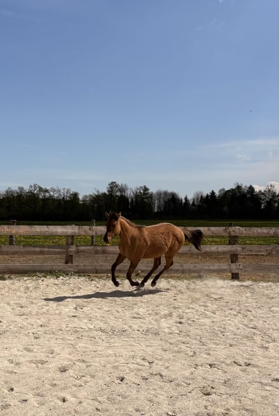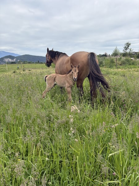 Quarter Horse Hengstjährling (derzeit 140 cm), Custom Gun Smoke x Lovers Magic Girl, 5/2025 geboren, Farbe Dun, sucht ein neues Zuhause. Er überzeugt durch sein korrektes Gebäude, seine gute, ausgewogene Bemuskelung und seinen freundlichen Charakter. Er wächst in einer gemischten Herde auf großen Flächen auf, ist gut sozialisiert und kennt Tierarzt sowie Hufschmied. Bei uns am Betrieb ist immer viel los, somit wächst der junge Mann mit Kindern, Traktoren, Hunden, Kühen usw auf, die besten Vorraussetzungen für einen soliden Partner für Freitzeit und Turnier. Auch seine 4-jährige Vollschwester (letztes Bild), 155 cm, steht am Betrieb und zeigt sich sehr talentiert für Reining und Allaround. Wenn gewünscht, darf „Brandy“ gegen Aufpreis auch zur weiteren Aufzucht bei uns bleiben. Auf Wunsch kann er gerne als Wallach verkauft werden.