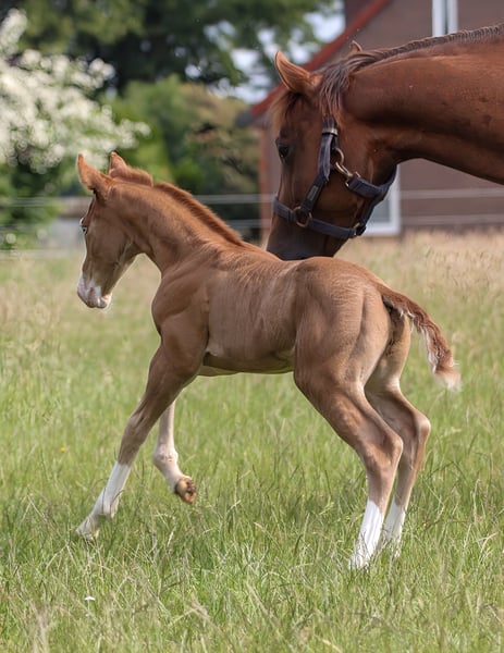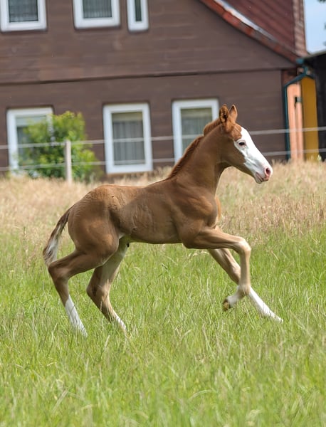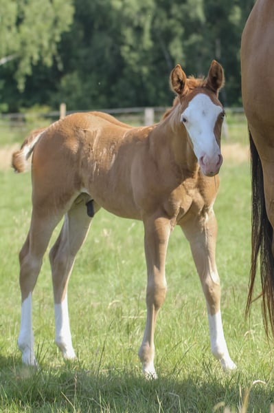 Cole - seine schöne Farbe, das blaue Auge und sein bildhübsches Erscheinungsbild machen ihn zu einem echten Hingucker. Er ist 2025 geboren und wird ein geschätztes Endmaß von 150 cm bekommen. Cole ist ein kompakter, kräftiger und stark bemuskelter Quarter Horse Hengst. Sein gutes Gebäude, seine Gesundheit und sein freundlicher, menschenbezogener Charakter sprechen für ihn. Cole ist gut sozialisiert, kennt Tierarzt und Hufschmied, wächst in einer kleinen Stuten- und Fohlengruppe auf. Seine Gelassenheit, Lernwilligkeit und Offenheit machen ihn leicht im Handling und sehr angenehm im Umgang. Mit erstklassiger Reining-Abstammung ist er bestens für den Sport, Turnier oder auch die Freizeit geeignet. Cole zeigt beeindruckende Bewegungen und hat das Potenzial, ein richtig athletisches Pferd zu werden. Da er ein Hengstanwärter ist, wird er gerne in entsprechende Hände abgegeben, aber auch Freizeitreiter mit gehobenen Ansprüchen können mit ihm glücklich werden. Die klinische AKU wird im Rahmen des Verkaufs von der Züchterin in Auftrag gegeben.