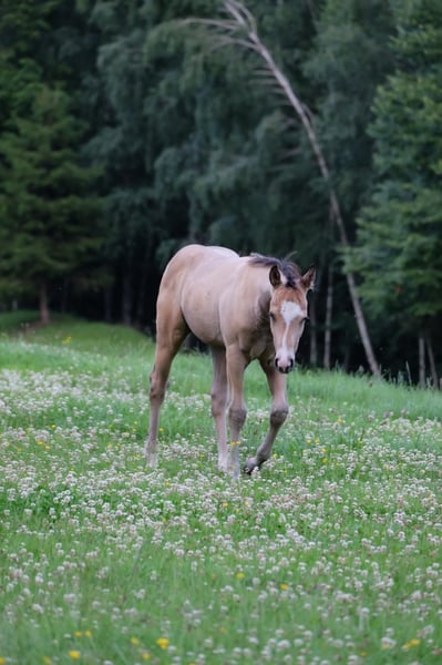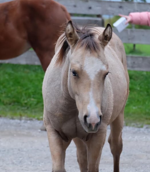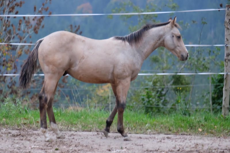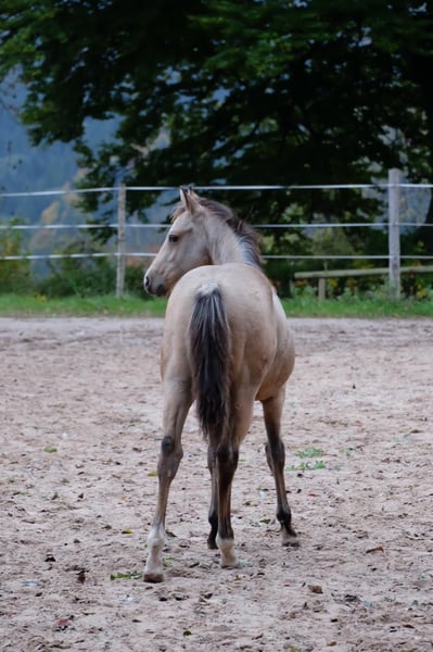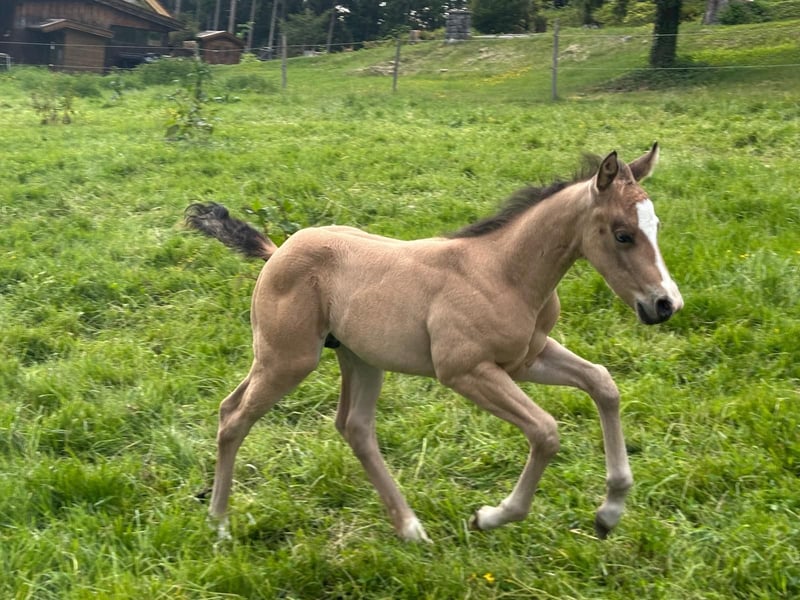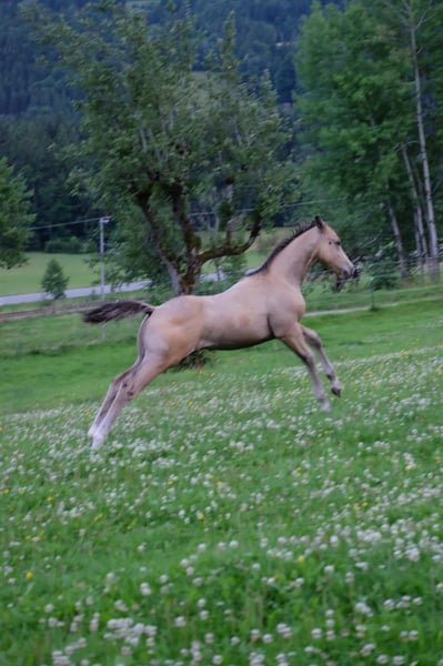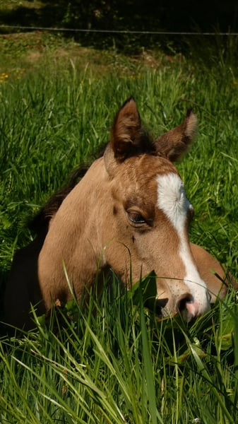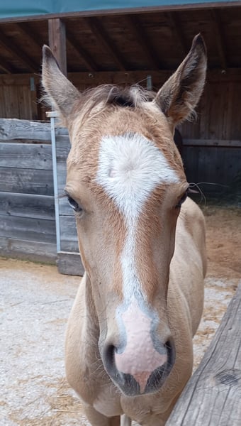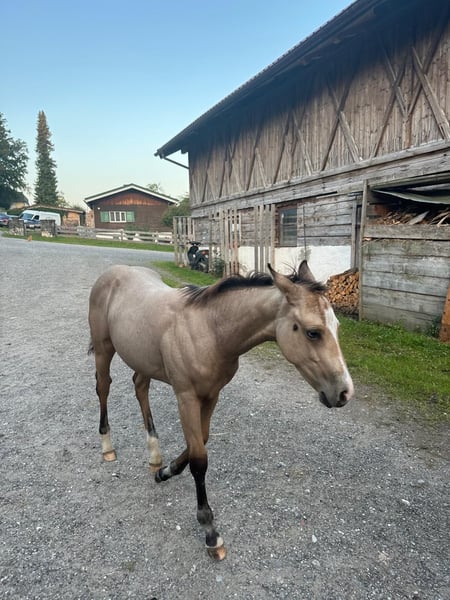 Our little "Floyd" is looking for a new home after weaning in the fall (earliest November). He is growing up with us in a species-appropriate manner in a mixed herd on large pastures with foal companionship. Floyd is very people-oriented, curious, fearless, and incredibly affectionate. The icing on the cake for this great guy is his beautiful buckskin color with Splash Gene (partial blue eyes). We are happy to place him in supportive hands. He can stay with us for further rearing upon agreement. He will learn the foal ABC with us until weaning and will be regularly dewormed and introduced to the farrier. For more information, feel free to call. Upon request, he can be registered with NRHA Germany and Euro.