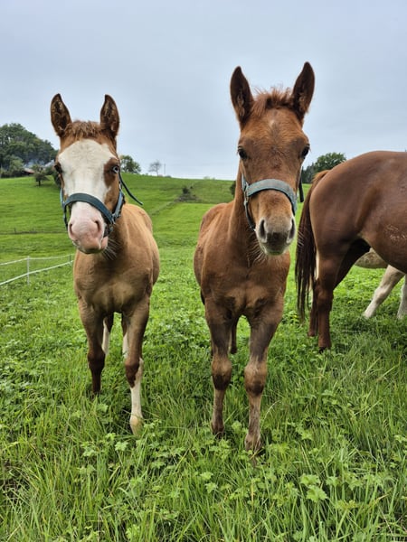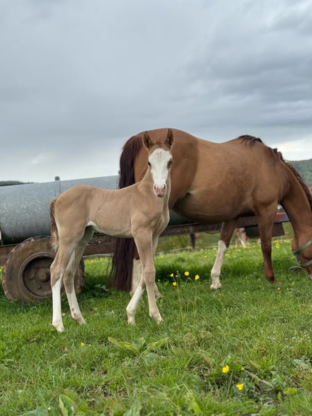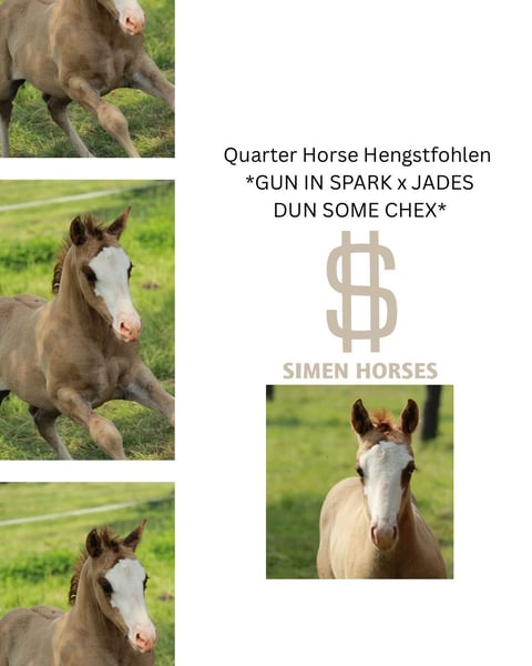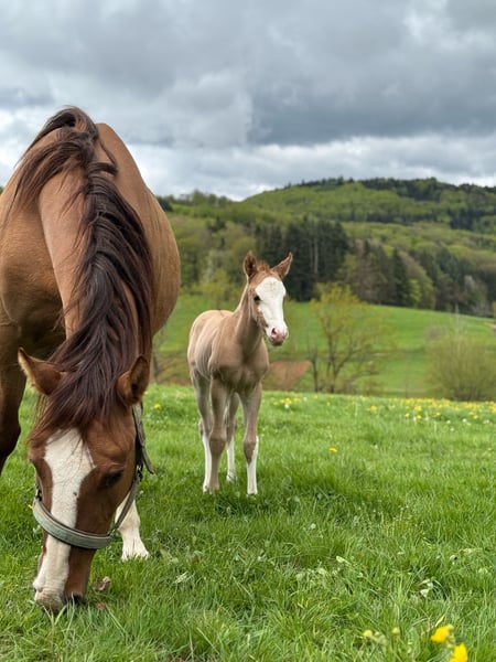 Very expressive, strong colt with an excellent pedigree - suitable for sport and of course also for ambitious leisure riders. Wide blaze. One blue eye. Estimated final height 150cm. Will learn the basics of foal training before leaving. Grows up healthy on our large Black Forest pastures, in a herd. - Stable foundation and strong bones - Good conformation - Cheeky character - Easy to handle - 5 Panel N/N via the parents - CoR AQHA and DQHA passport are applied for **Entering the yard and pastures for viewings, as well as riding the sale horses, is always at your own risk! Exclusion of any warranty! We charge €50 for trial rides of our sale horses. This amount will be deducted from the purchase price of a horse.**