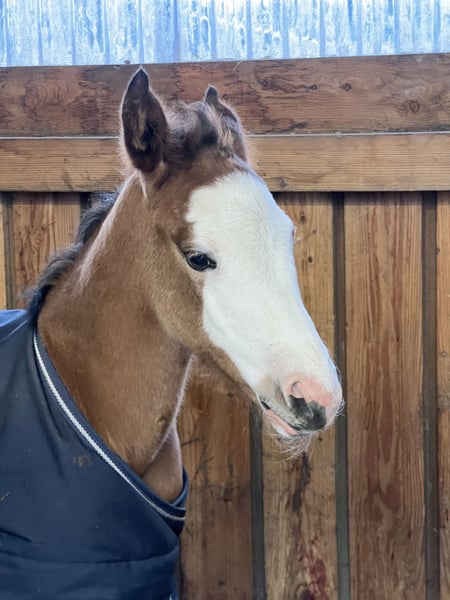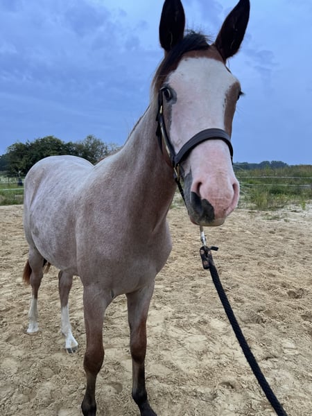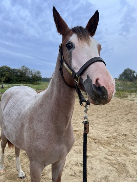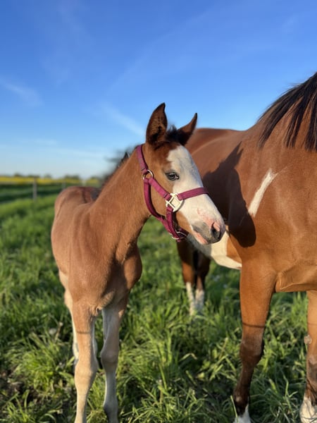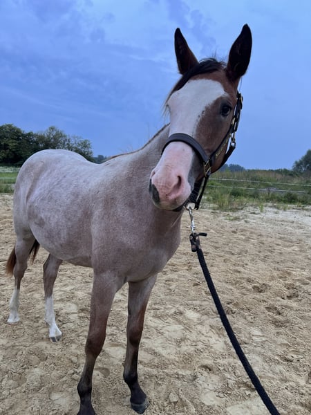 We are looking for a new home for our beautiful Boons Shining River aka Rita. Rita is an absolute dream horse that has all the prerequisites for a great leisure partner. She was born on April 23, 2024, has the special color Bay Roan Overo, and is expected to reach a height of 155 cm. Rita has a solid foundation on straight legs, just as one would wish! She knows the basics of foal training, accompanies us on trail rides, stands calmly for the farrier, and loads onto the trailer. We are searching for a truly wonderful home for this pretty girl where she can continue to be developed. Her mother is a Paint x Thoroughbred mare who has never been sick in her life, and her father is Redwhiteandblue Boon, a famous cutting stallion with a fantastic character. Rita has papers from the American Half Quarter Association. * handled daily * daily mineral supplementation * dewormed 4 times a year * vaccinated If Rita has caught your interest, please feel free to contact us.