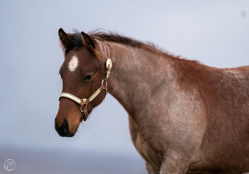Sehr schickes, korrekt gebautes und mega umgängliches Hengstfohlen in der besonderen Farbe Bay Roan. Loui überzeugt mit guter Bewegung, starkem Fundament und viel Ausstrahlung.