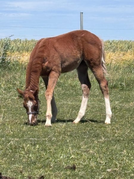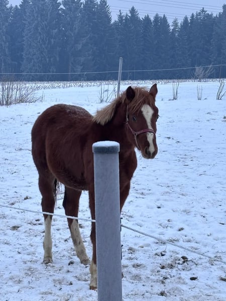 Hot Nite Invitation - ein bildhübscher Quarter Horse Hengst, geboren am 13. März 2025. Mit seiner eleganten sorrel-Farbe, seinem korrekten Gebäude und der harmonischen Bemuskelung ist er ein echter Blickfang. Er wird voraussichtlich ein Endmaß von etwa 160 cm erreichen und damit später auch größere Reiter gut abdecken können. Seine AQHA-Papiere liegen bereits vor. Dieser junge Hengst wächst artgerecht im Herdenverband auf und kennt sowohl Paddock-Box als auch Weide. Er ist altersentsprechend geimpft, regelmäßig entwurmt und an Tierarzt sowie Hufschmied gewöhnt. Hot Nite Invitation zeigt sich stets brav, ruhig und gelassen, dabei aber aufmerksam, lernfreudig und charakterstark. Sein menschenbezogener, lieber Charakter macht den täglichen Umgang mit Rocky zu einer Freude. Auch unter Bewegungsaspekten weiß dieser Youngster zu überzeugen: Er zeigt bereits jetzt schöne, taktreine Grundgangarten und bringt das Potenzial für eine erfolgreiche Laufbahn im Sport oder auf Turnieren mit. Dank seiner erstklassigen Pleasure- und Allround-Abstammung (Hotroddin Invitation x Nite Chip) eignet er sich ebenso hervorragend als zuverlässiger Freizeitpartner. Hot Nite Invitation ist DQHA Futurity startberechtigt, kennt das Fohlen-ABC und ist selbstverständlich halfterführig. Mit seinem hervorragenden Exterieur, seinem angenehmen Wesen und seinem vielseitigen Talent ist er ein echtes Versprechen für die Zukunft - ganz gleich, ob als Showpferd oder treuer Freizeitkamerad. Kann gerne zur Aufzucht bleiben.