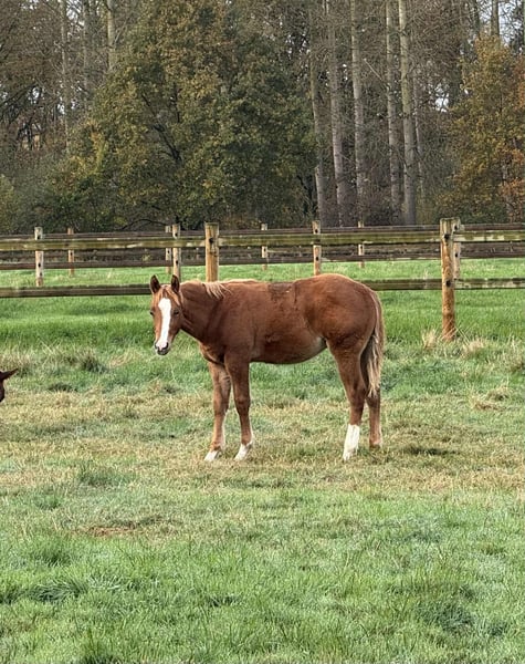🌟 Te koop: Infinity 66 (“Aster”) – veelbelovend Quarter Horse hengstveulen 🌟 Geboortedatum: 6 juni 2025 Afstamming: Lil Dancing Queen x ND Pop Gun Trash (Gunnatrashya) Maak kennis met Infinity 66, roepnaam Aster – een uitzonderlijk hengstveulen met een gouden toekomst in de Reining sport. Aster is het resultaat van een bewezen combinatie tussen Lil Dancing Queen en ND Pop Gun Trash, een hengst uit de populaire Gunnatrashya-lijn. Deze match werd bewust gekozen vanwege de sterke bloedlijnen én de eerdere succesvolle nakomeling uit dezelfde combinatie. ✨ Afstamming & prestaties: • Moeder: Lil Dancing Queen – zelf NRHA-earner met $1.850 lifetime earnings en offspring earnings van meer dan $43.000. • Vader: ND Pop Gun Trash – zoon van de legendarische Gunnatrashya, bekend om zijn uitstraling, atletisch vermogen en sterke verervingskracht. 🐴 Over Aster: Infinity 66 is een vriendelijk, nieuwsgierig en energiek veulen dat nu al graag zijn natuurlijke talenten laat zien in de weide. Hij beweegt soepel, met veel balans en expressie – eigenschappen die hem perfect maken voor de Reining arena. Aster heeft het potentieel om, net als zijn zussen, uit te blinken in de sport. Wij zoeken voor hem dan ook een showhome waar hij de kans krijgt om zich volledig te ontwikkelen en te schitteren. 📍 Samenvatting: • Quarter Horse hengstveulen • Geboren: 06/06/2025 • Kleur: sorrel • Afstamming: Lil Dancing Queen x ND Pop Gun Trash (Gunnatrashya) • Verwachte discipline: Reining • Karakter: lief, nieuwsgierig, atletisch 💫 Infinity 66 – geboren om te bewegen, gefokt om te presteren.