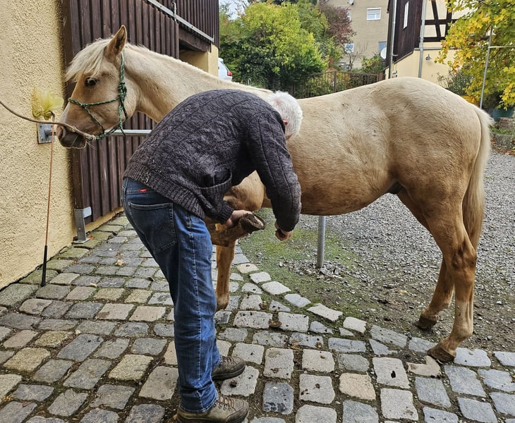 Peppy Doc King Maxen - Dieser 2024 geborene Palomino (Endmaß ca. 148 cm) mit traumhafter weißer Mähne und Schweif ist ein absoluter Eyecatcher - kompakt, korrekt gebaut und mit vielversprechenden Proportionen. Ein Nachwuchspferd, das nicht nur durch seine Optik, sondern auch durch seinen tollen Charakter überzeugt. Er ist menschenbezogen, freundlich, aufmerksam und lernwillig. Im täglichen Umgang zeigt er sich artig, entspannt und unkompliziert. Herausforderungen begegnet er mit Mut und Neugier und lernt schnell. Schon jetzt lässt er sich problemlos verladen und geht ruhig und gelassen an der Hand ins Gelände. Der Hengst wächst gesund und robust im Offenstall in gemischter Herde auf und wird liebevoll und mit viel Sachverstand an seine Aufgaben als Reitpferd herangeführt - nach den Prinzipien des Natural Horsemanship, Schritt für Schritt und ohne Zeitdruck. Die Farbgenetik (e/e, A/a, CH/ch) macht ihn nicht nur farblich besonders interessant, sondern eröffnet auch züchterisch Potenzial. Peppy ist altersgemäß geimpft und regelmäßig entwurmt. Seine Abstammung lässt keine Wünsche offen: Top Cuttinglinien (Enkel von Peptoboonmal) väterlicherseits treffen auf ausgezeichnete Reiteigenschaften mütterlicherseits - eine ideale Kombination für Sport, Turnier und Freizeit. Der Hengst ist DQHA sowie Regional-Futurity startberechtigt und bringt alles mit, um in Zukunft ein vielseitig einsetzbares Reitpferd mit Charme, Talent und Herz zu werden.