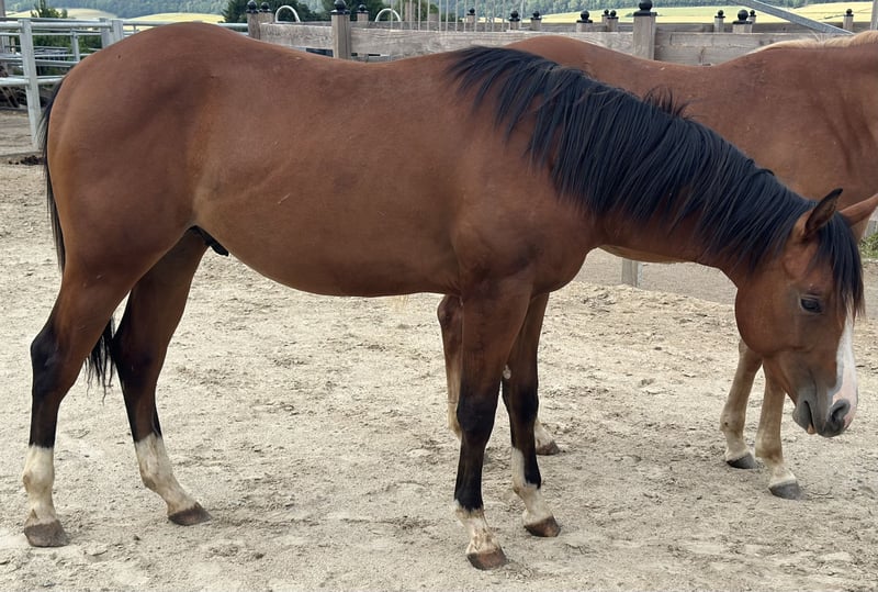 2024 Bay 5-panel n/n AQHA / APHA NRHA registration paid in Germany Optional EWU registration available Sire: Spooks Gotta Outfire (Spooks Gotta Whiz x Custom Crome) — a promising stallion from the USA 🇺🇸 Dam: Yellow Melody (Yellow Jersey x Smatin Off) Blake is a true eye-catcher! Absolutely well-built with a solid foundation and stunning appearance. He is very curious by nature and highly attentive to humans. He learns quickly and has a strong willingness to please. So far, he has not shown any stallion-like behavior and is growing up appropriately with his herd in an open stall / pasture. He has great potential for reining sport, but his exceptional movement also makes him a fantastic candidate for ranch riding. An excellent prospect for the EWU young horse program or your next futurity star ⭐️ Preferably in a nurturing and supportive home 🏠 Raised directly by the breeder with lots of love and expertise, and kept in a health record.