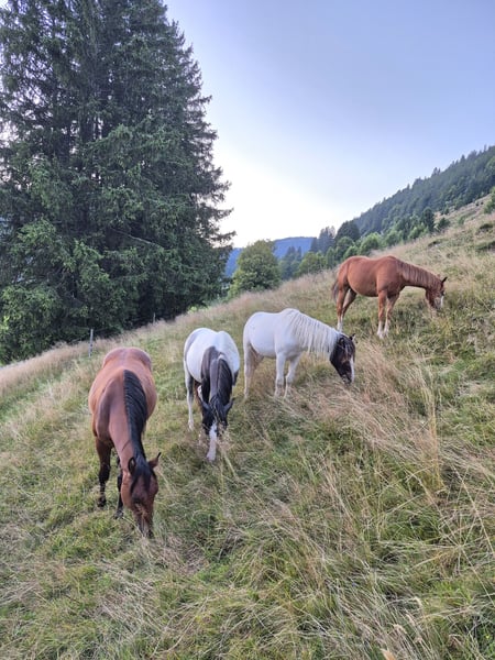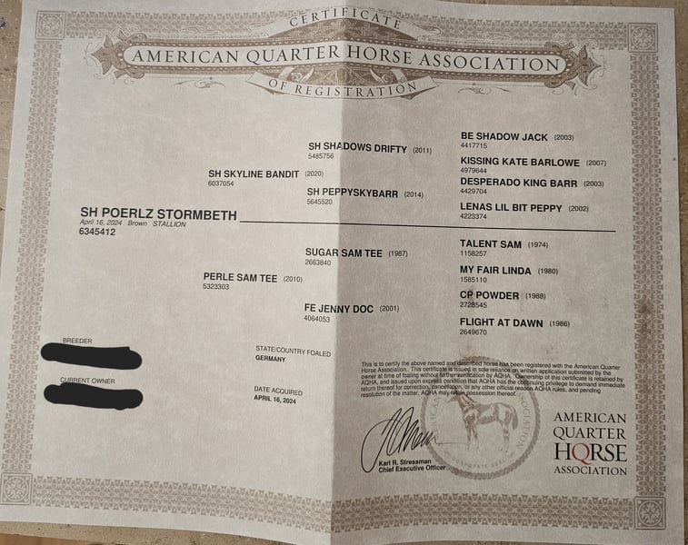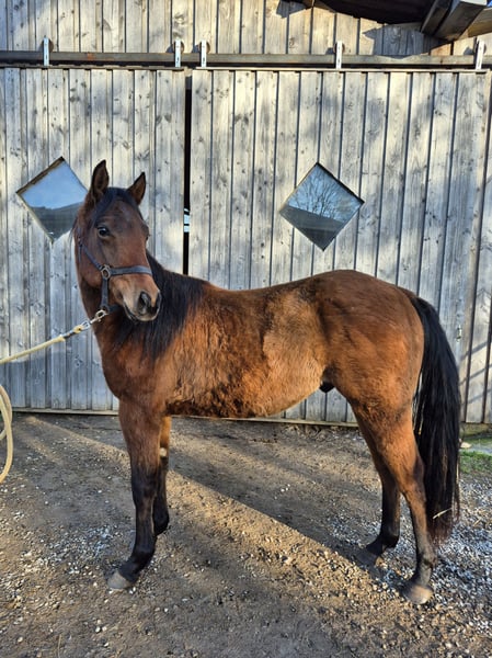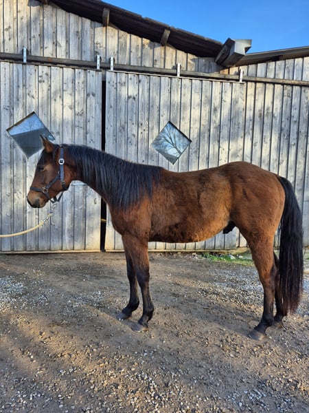 Stormy is a very friendly and trusting stallion. A large-framed horse with strong, sturdy bones. Estimated height at withers: 15.5 hands. Good pedigree—suitable for sport and also ideal for ambitious recreational riders. Clear-minded. Grows up healthy on our large Black Forest pastures, in a herd environment. - All-rounder - Calm temperament - Load and farrier friendly - Easy to handle when loading and shoeing - CoR AQHA and Pass DQHA registered **Please note that entering the farm and pastures for viewing, as well as riding sale horses, is always at your own risk! Any liability is expressly excluded! A test ride of our sale horses costs €50. This amount will be deducted from the purchase price if you buy a horse.**