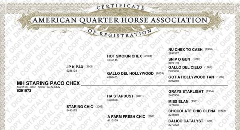 Quarter horse 2 years old colt Paco is friendly, calm and with no bad habbits, ready for new lessions and advantures. He is waiting to meet you. He has 6 pannel test: IMM & MYH1 N/N HYPP N/N HERDA N/HRD PSSM N/N GBED N/N MH N/N He has ID and pedigree. Genetics: Just like his sire JP K Pax, his grandsire Hot Smokin Chex, and his distant uncle Big Chex To Cash, our Paco is also a carrier of the HERDA gene. This disorder is recessive, which means that a horse carrying only one copy of the gene is completely healthy. If you would like to keep him as a breeding stallion, he may only be bred to mares that are HERDA N/N and also PSSM N/N. By agreement, he can also be gelded. On two pictures is his dad JP K Pax. More informations, pictures and videos on pm. 📍Located in Slovenia near Italian border (Gorizia)