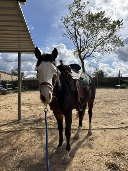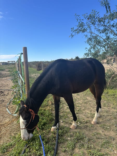 Er ist ein außergewöhnlich typvoller 2 jähriger American Quarter Horse Hengst, der durch seinen Traumcharakter hervorsticht: Er ist nicht dominant, testet nicht, zeigt null hengstiges Verhalten. Er ist super sozial. Er ist so cool und gelassen, dass sogar Kinder mit ihm ins Gelände spazieren gehen können. Sein Charakter ist eine absolute Seltenheit. Er ist jetzt schon fast ein Verlasspferd. Super einfach zu handhaben. • Geht alleine super ruhig ins Gelände • Kennt Hunde, Traktoren, Verkehr, Maschinen – völlig unerschrocken • Freiheitsdressur/Grundschule: • Seitengänge • Spin vom Boden • Parkieren / Sidepass zum Aufsteigen • Bereits an Sattel & Reitergewicht gewöhnt • Sehr kooperativ, überall gut anzufassen, höflich im Umgang • Hufschmied / Tierarzt / Zahnarzt: → muss nicht einmal angebunden werden so easy ist er drauf Optisch überzeugt er durch seine seltene dunkelbraune Farbe, das markante Gunner-Gesicht und zwei blaue Augen und der bereits langen Mähne – ein echter Blickfang in jeder Reitanlage. Er ist doppelt registriert ( Paint und Quarter) War Prämienfohlen. Wer ein geniales und super einfaches Pferd zum weitermachen sucht… Nur in aller allerbeste Hände !!! Transport kann organisiert werden. Preis: Mach mir ein Angebot! Nur ernsthafte Interessenten. Insta: diary_of_face Standort: Spanien.