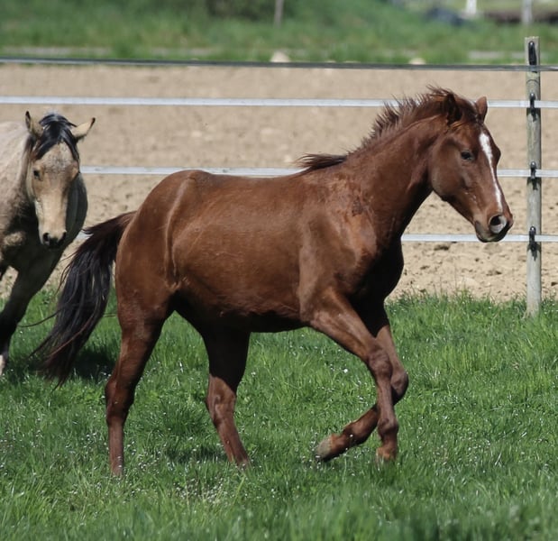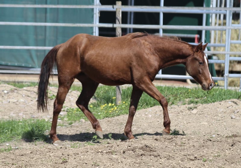 ‚Dual Cash SR‘ ist ein liebenswürdiger, super athletisch gebauter Junghengst, in wunderschönem chestnut! Seine Mutter ist eine direkte Dual Peppy Stute aus einer Smart Little Lena x Poco Bueno Mutter. Sein Vater ist Little Chex to Cash. Beide Elterntiere sind erfolgreich Reining geshowt. Verfügen über einen tollen Cowsense und generieren super rittige, sehr brave Nachzucht. „Haribo“ lebt in Offenstallhaltung mit anderen Junghengsten und Wallachen, kennt Hänger fahren, selbstverständlich das Jungpferde ABC, Bodenarbeit und ist anlongiert. 6 Panel N/N
