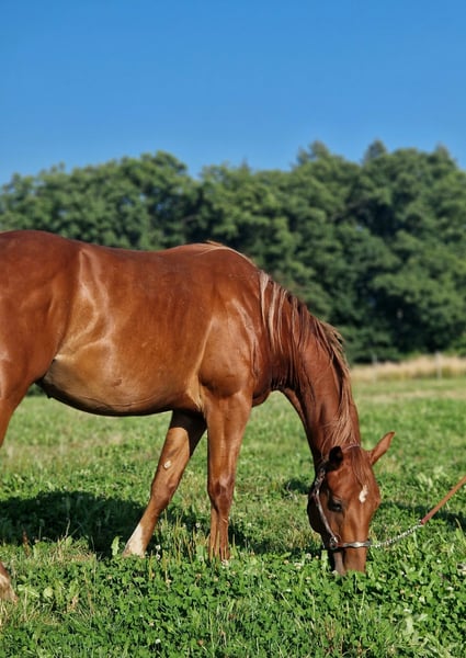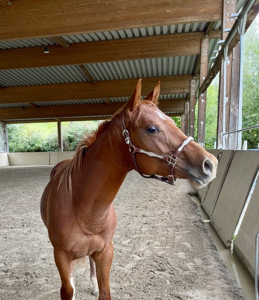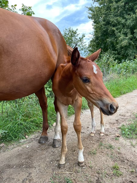 We are also looking for a 5 star home for our "Leo". The cool Quarter Horse stallion (born 2023) saw the light of day with us. His parents are also on our farm: Dam: TL Blue Alice (Aint It The Blues) Sire: Zippos King Bar Leo is a "cool sock" in every respect. He wants to please his owner at all times and is always calm and quiet. He has an athletic, correct conformation and is blessed with an outstanding gait. He is suitable for both competitions and leisure time. He is currently still a stallion and shows no stallion behavior. He is simply a treasure to handle. He has learned everything you need to know at this age: Giving hooves, introducing him to the farrier, grooming, showering/washing, walking/leading. Leo has all his basic vaccinations, is regularly wormed, has a DQHA equine passport and an AQHA certificate of registration. He is currently being bred with other young horses at our stables. He can either stay here for further rearing or move to his new home. If you would like to get to know Leo, just write to us.