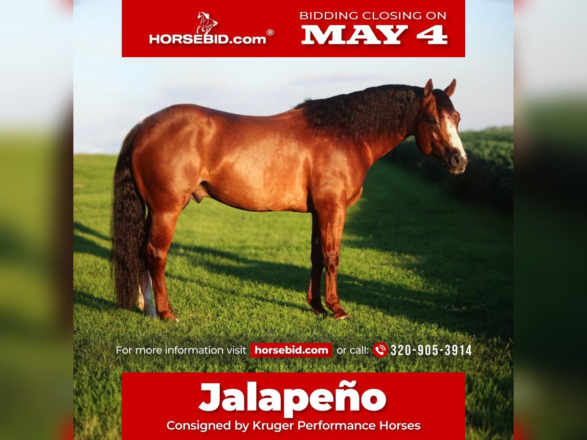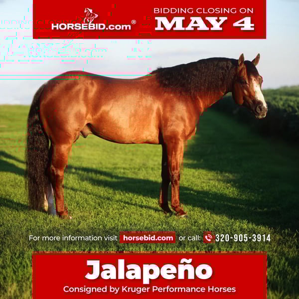 ▪️▫️◾️𝐭𝐡𝐞 𝑴𝒂𝒚 𝐒𝐞𝐥𝐞𝐜𝐭◾️▫️▪️ Happening now thru MONDAY | MAY 4th - Available EXCLUSIVELY on HorseBid's website! For more details and to register visit: www.Horsebid.com CONSIGNOR CONTACT: Kruger Performance Horses 320-905-3914 LOCATION: Eloy, AZ BREED: Quarter Horse REGISTERED: Yes REGISTERED NAME: Hot Jule COLOR: Chestnut HEIGHT: 14.1 AGE: 6 GENDER: Stallion An opportunity like this doesn’t come along often. Jalapeño is the kind of horse people stop what they’re doing to watch—the total package of talent, presence, and personality. Standing 14.1 hands, he’s built to catch your eye and keep it. With a refined head, expressive eye, and that long, flowing mane and tail, he has the kind of look that turns heads whether he’s in the show pen or standing tied at the trailer. But Jalapeño is far more than a pretty face. He’s a proven performer—an NRCHA Open Snaffle Bit Futurity Finalist with over $10,000 in earnings. He’s confident in the herd, powerful down the fence, and stylish in his reining work. He carries himself naturally in the bridle and has that eye-catching presence on the rail that judges notice. What really sets him apart is his versatility. Jalapeño has stepped seamlessly into ranch versatility events and is thriving. He handles obstacles with ease, enjoys the trail, and approaches every job with a willing, workmanlike attitude. He’s the kind of horse that meets you at the gate, loves attention, and genuinely enjoys having a job to do. His pedigree only adds to his appeal. Sired by Hottish and out of Soula Jule Forever—a mare whose offspring have earned over $700,000—Jalapeño offers serious potential not just in the arena, but in the breeding shed. He’s an ideal outcross for today’s top performance bloodlines, including Dual Rey, High Brow Cat, and Peptoboonsmal mares. He is currently being shown and will continue to be campaigned up to sale day. Jalapeño sells 100% sound to ride and breed, and comes with a complete semen evaluation. If you’re looking for a horse that combines proven ability, standout looks, exceptional disposition, and long-term value—Jalapeño is one you don’t want to miss!