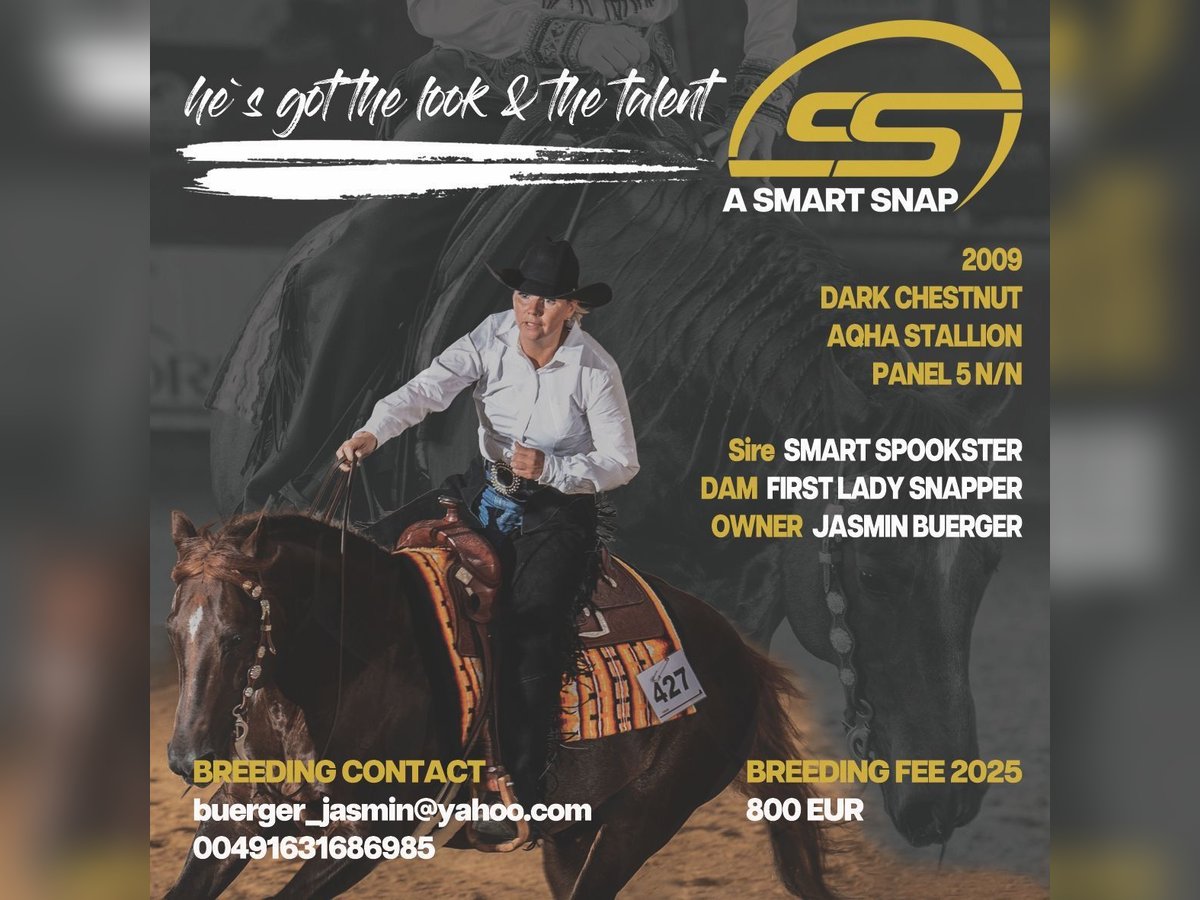 Snap ist ein toller 17jähriger gekörter (DQHA) QH Hengst mit ganz viel Charme und besten Fundament. Unter Emanuel Ernst wird er Sechster der FN Deutschen Meisterschaft 2018, ist multiple Bronze Trophy Champion und World Show Qualifier und außerdem feierte er schon viele Erfolge in anderen Open Klassen Verbänden, auch im Non Pro Bereich gibt er immer sein bestes. Er in Windeck zu Haus und genießt dort sein Leben auf saftigen Wiesen. Auch 3 seiner Nachkommen aus dem letzen Jahr stehen auf der Anlage. Mit seinen 17 Jahren gehört er noch nicht zum alten Eisen und pflückt noch immer Furchen in den Sand. Auch Bodenarbeit und Zirkuslektionen machen uns viel Freude. Snap wird häufig auch von unserer Tochter geritten und ist nie blöd, hengstig oder unkontrollierbar. Er ist einfach ein so tolles Pferd. Snap deckt im Natursprung. Bei allen Fragen gerne anrufen oder email schreiben. Wir freuen uns auf Nachrichten 😊