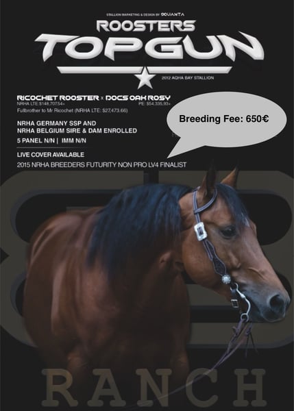 ROOSTERS TOPGUN 2012 bay AQHA Stallion Sire: Ricochet Rooster (NRHA LTE:$148,707.54+, Offspring Earnings $865,372.48+) Dam: Docs Oak Rosy (PE: $54,335,93+) Fullbrother to Mr Ricochet (NRHA LTE: $27,473.66) 6 Panel N/N NRHA Germany SSP enrolled NRHA Belgium Sire & Dam enrolled Natursprung/Live cover available Breeding Fee: 650€ Photocredits: C. Heese-Hußmann Photographie
