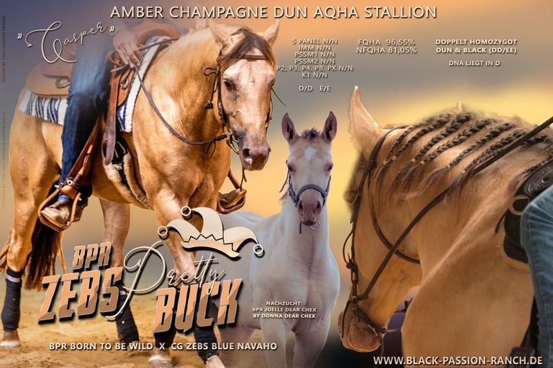 Sehr großrahmiger Hengst mit einer perfekten Genetik. Er ist in @all Panel Tests N/N getestet. Casper stammt aus rein amerikanischen Eltern und macht ausschließlich Dun Fohlen und keine Füchse. Seine Nachzucht ist ausgesprochen hübsch, intelligent und alle Fohlen bekommen diese extrem harten Hufe und das stabile Gebäude mit auf den Weg für immer. Wir haben TG oder er deckt im Natursprung. https://www.allbreedpedigree.com/bpr+zebs+pretty+buck
