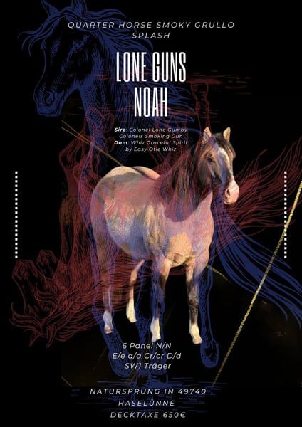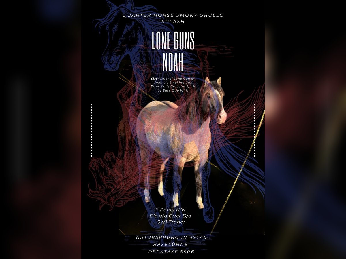 Lone Guns Noah ist ein super Reining gezogener Hengst in der Sonderfarbe Smoky Grullo Splash. 6 Panel n/n Sw1-Träger Deckt im Natursprung in 49740 Haselünne.