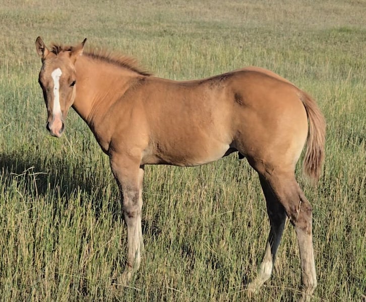 Super good red dun with a dark chestnut mane and tail with a light red dun body, which is very very striking. In addition to his really cool color, this guy is an awesome stout cow horse. His hip goes on forever and his body is deep and stout. He is out of my favorite mare that has produced tremendous horses. “Tonka” is a keeper!