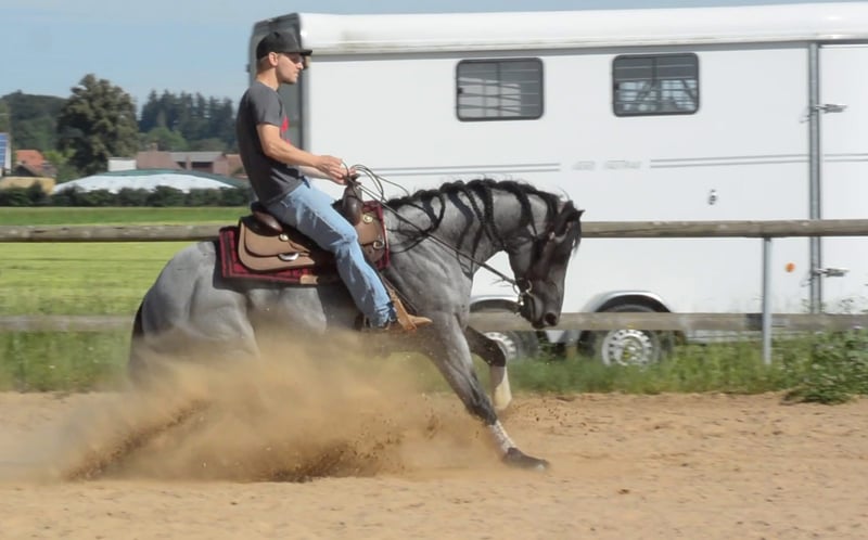 Potro de raza Quarter Horse, potro de color bay roan, línea Hancock