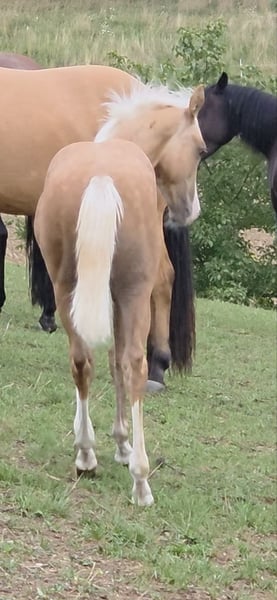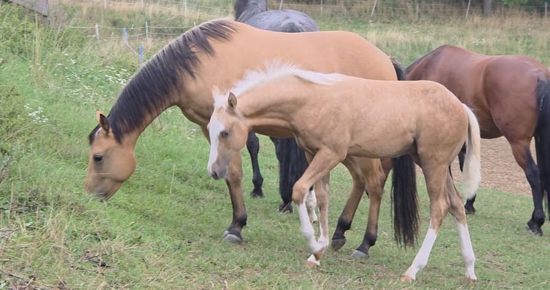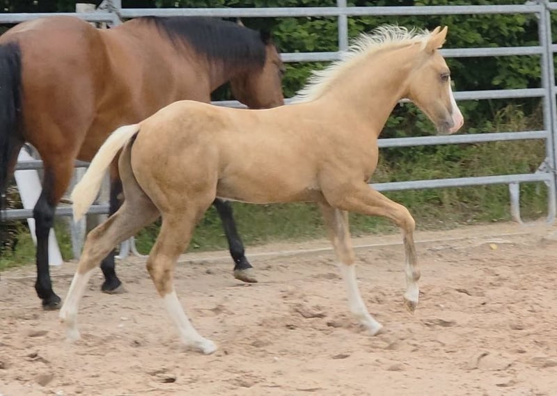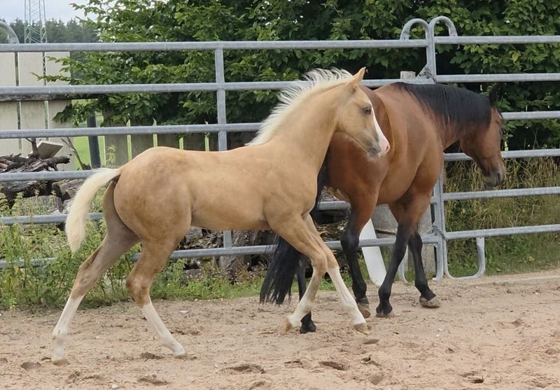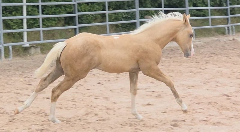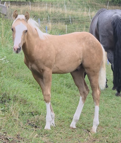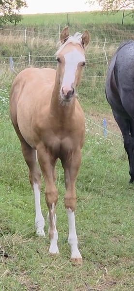 Zum Verkauf steht ein vielversprechender American Quarter Horse Hengst, geboren April 2025. **HES A CAT CHIC OLENA** aka ODIN Genetisch getestet und 6 Panel N/N Dieser wunderschöne Palomino wird vermutlich ein Stockmaß von 150 cm erreichen Er überzeugt uns derzeit durch sein charmantes Wesen und seine ansprechende Statur , korrektes Gebäude und tolle Bewegungen. Wir sehen in ihm klare Ansätze zum Westernsport für ambitionierte Reiter aber auch als Familien Pferd . Ein dem Menschen sehr zugetaner und freundlicher Charakter runden Ihn ab und wir sehen ihn sowohl für erfahrene Reiter als auch für Familien/ Menschen geeignet, die sich einen zuverlässigen Partner wünschen und aufziehen wollen. Er ist gut sozialisiert, kennt den Umgang mit anderen Pferden. Seine Bewegungen sind geschmeidig, schnell , balanciert und kraftvoll, was ihn zu einem idealen Kandidaten für verschiedene Disziplinen im Westernreiten macht. Von seiner Abstammung her könnte er sich auch für die Rinderklassen gut eignen. Ausziehen konnte er ab Ende Oktober COR und Equidenpass sind vorhanden die ersten Tetanus Impfungen zur Grundimmunisierung stehen Ende Oktober an . Er wird tgl gehändelt und kennt Hufpflege. Bei Interesse oder weiteren Fragen stehe ich Ihnen gerne zur Verfügung. Lassen Sie sich diese Gelegenheit nicht entgehen, einen so talentierten jungen Hengst in Ihre Familie aufzunehmen!